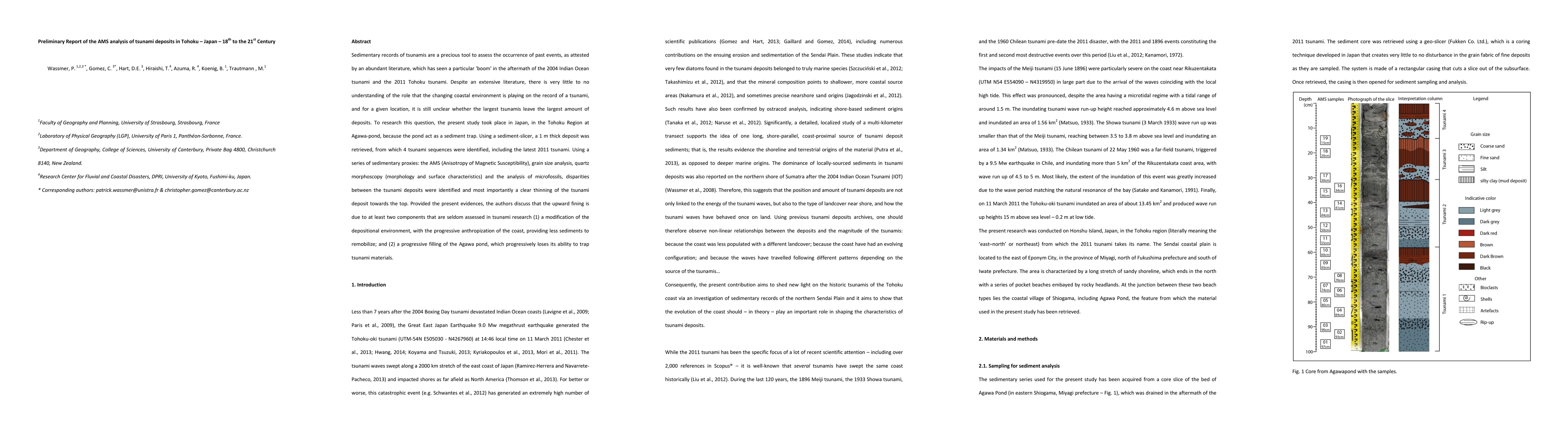 This study investigates tsunami deposits in the Tohoku Region of Japan using AMS analysis and other sedimentary proxies to identify four tsunami sequences, including the 2011 event. The findings reveal a clear thinning of deposits over time, attributed to coastal modification and the progressive filling of the Agawa pond, highlighting the impact of environmental changes on tsunami records.