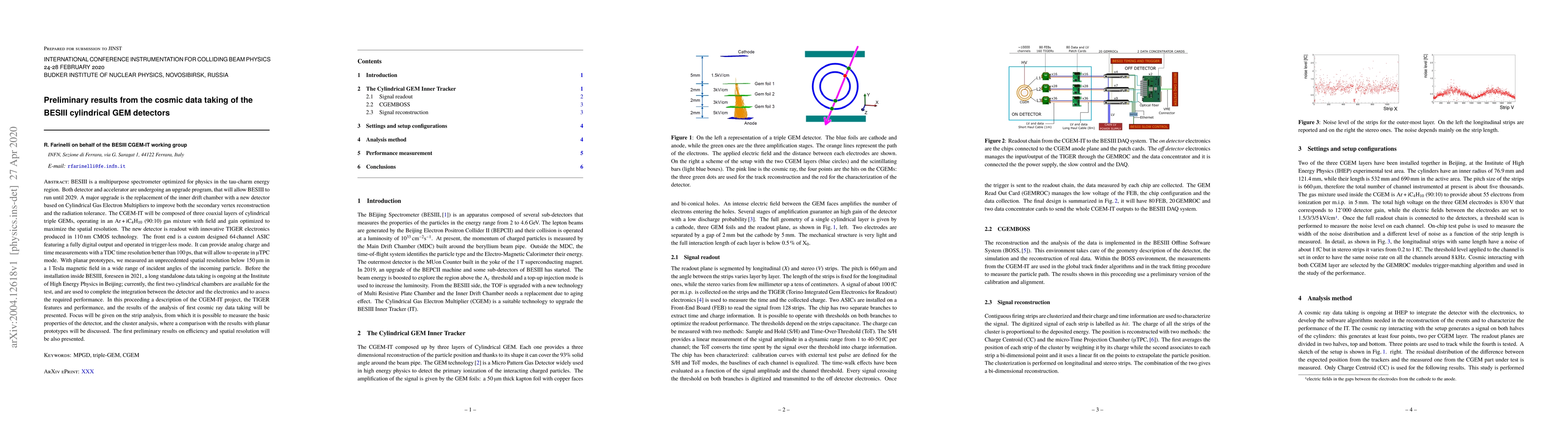 BESIII is a multipurpose spectrometer optimized for physics in the tau-charm energy region. Both detector and accelerator are undergoing an upgrade program, that will allow BESIII to run until 2029. A major upgrade is the replacement of the inner drift chamber with a new detector based on Cylindrical Gas Electron Multipliers to improve both the secondary vertex reconstruction and the radiation tolerance. The CGEM-IT will be composed of three coaxial layers of cylindrical triple GEMs, operating in an Ar$\,$+$\,$iC$_4$H$_{10}$ (90:10) gas mixture with field and gain optimized to maximize the spatial resolution. The new detector is readout with innovative TIGER electronics produced in 110$\,$nm CMOS technology. The front end is a custom designed 64$\,$channel ASIC featuring a fully digital output and operated in trigger-less mode. It can provide analog charge and time measurements with a TDC time resolution better than 100$\,$ps, that will allow to operate in $\mu$TPC mode. Before the installation inside BESIII, foreseen in 2021, a long standalone data taking is ongoing at the Institute of High Energy Physics in Beijing; currently, the first two cylindrical chambers are available for the test, and are used to complete the integration between the detector and the electronics and to assess the required performance. In this proceeding a description of the CGEM-IT project, the TIGER features and performance, and the results of the analysis of first cosmic ray data taking will be presented. Focus will be given on the strip analysis, from which it is possible to measure the basic properties of the detector, and the cluster analysis. The first preliminary results on efficiency and spatial resolution will be also presented.