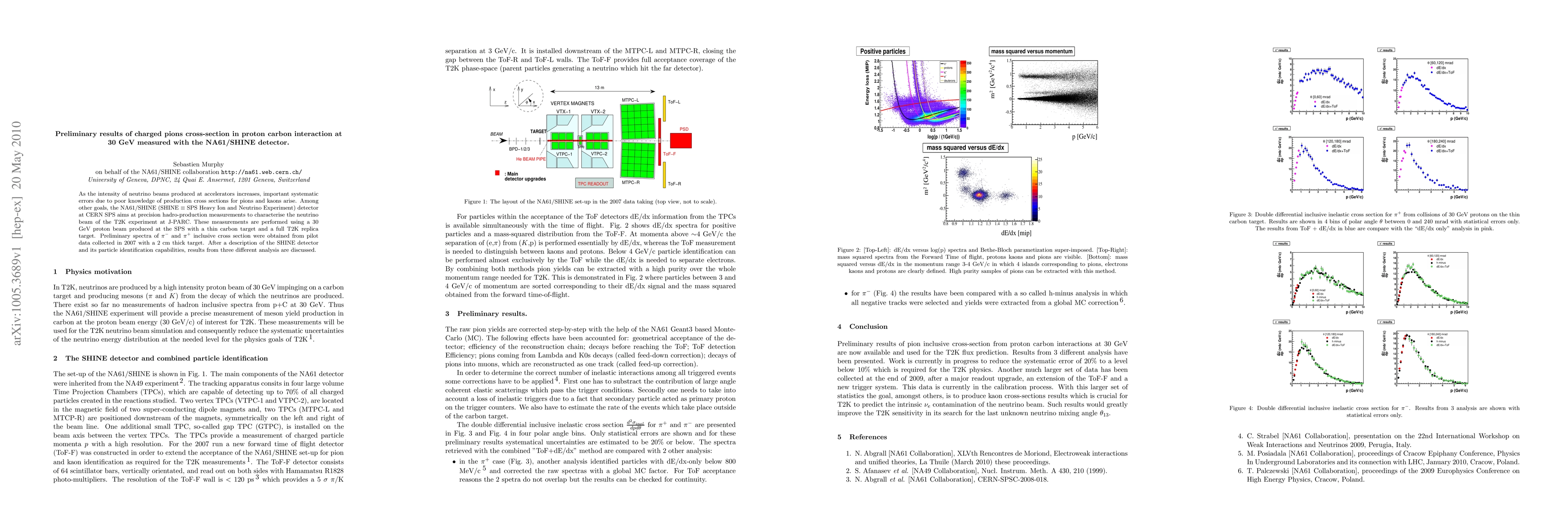 As the intensity of neutrino beams produced at accelerators increases, important systematic errors due to poor knowledge of production cross sections for pions and kaons arise. Among other goals, the NA61/SHINE (SHINE=SPS Heavy Ion and Neutrino Experiment) detector at CERN SPS aims at precision hadro-production measurements to characterise the neutrino beam of the T2K experiment at J-PARC. These measurements are performed using a 30GeV proton beam produced at the SPS with a thin carbon target and a full T2K replica target. Preliminary spectra of $\pi^{+}$ and $\pi^{-}$ inclusive cross section were obtained from pilot data collected in 2007 with a 2 cm thick target. After a description of the SHINE detector and its particle identification capabilities, results from three different analysis are discussed.