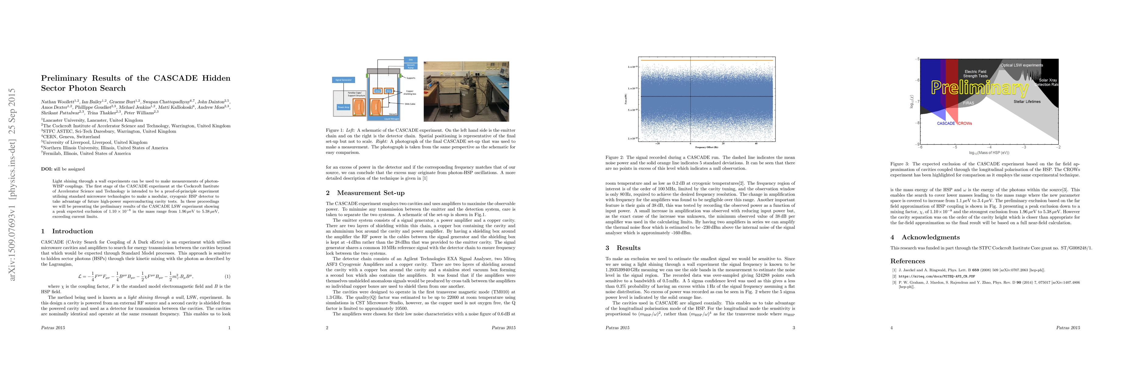 Light shining through a wall experiments can be used to make measurements of photon-WISP couplings. The first stage of the CASCADE experiment at the Cockcroft Institute of Accelerator Science and Technology is intended to be a proof-of-principle experiment utilising standard microwave technologies to make a modular, cryogenic HSP detector to take advantage of future high-power superconducting cavity tests. In these proceedings we will be presenting the preliminary results of the CASCADE LSW experiment showing a peak expected exclusion of $1.10 \times 10^{-8}$ in the mass range from 1.96$\mu$eV to 5.38$\mu$eV, exceeding current limits.