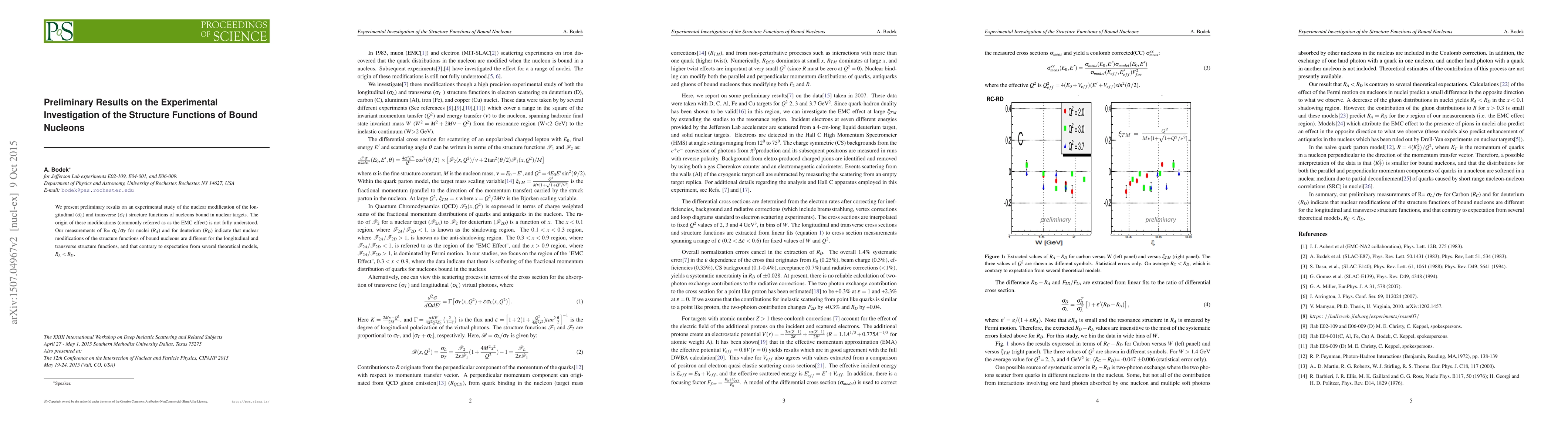 We present preliminary results on an experimental study of the nuclear modification of the longitudinal ($\sigma_L$) and transverse ($\sigma_T$) structure functions of nucleons bound in nuclear targets. The origin of these modifications (commonly referred as as the EMC effect) is not fully understood. Our measurements of R= $\sigma_L / \sigma_T$ for nuclei ($R_A$) and for deuterium ($R_D$) indicate that nuclear modifications of the structure functions of bound nucleons are different for the longitudinal and transverse structure functions, and that contrary to expectation from several theoretical models, $R_A< R_D$.