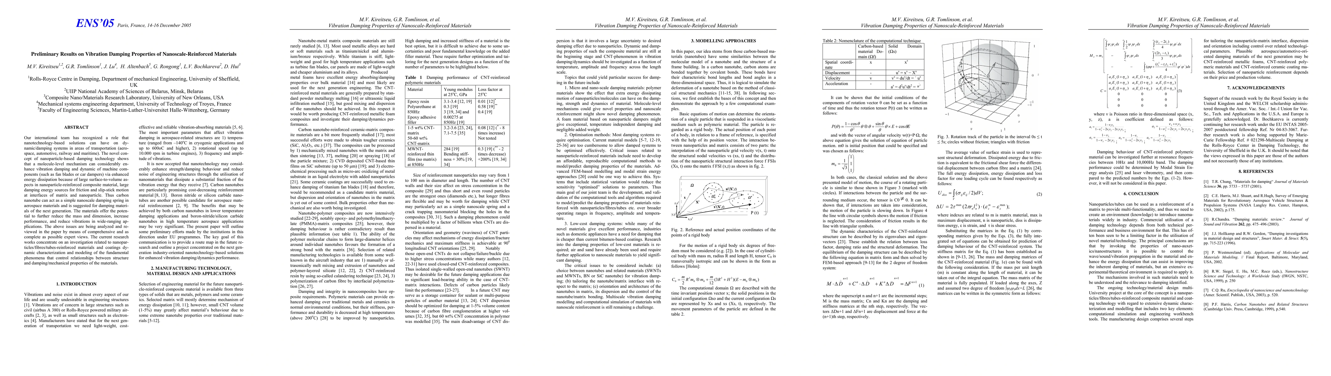 The focus in this paper is an analysis of existing state of the arts directed toward the development of the next generation of vibration damping systems. The research work concentrates on an investigation related to nanoparticles/fibres/tubes-reinforced materials and coatings dynamic characterization and modeling of the fundamental phenomena that control relationships between structure and damping/mechanical properties of the materials. We simulated composite materials using finite element and mesh free methods, using a hollow shell representation of the individual nanotube/fiber. Results of the research work will provide a platform for the development of nanoparticle-reinforced damping materials that are light-weight, vibration and shock resistant. The outcome of the research work is expected to have wide-ranging technical benefits with direct relevance to industry in areas of transportation (aerospace, automotive, rail), electronics and civil infrastructure development.