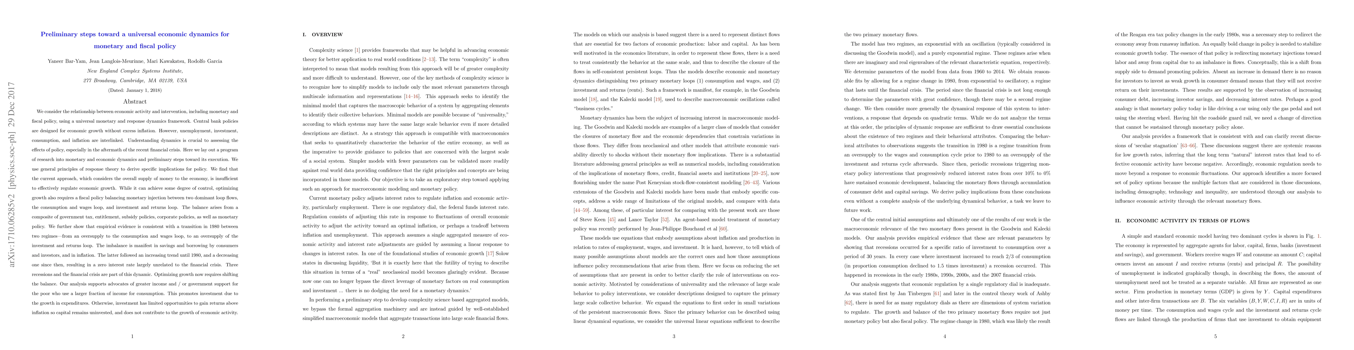 We consider the relationship between economic activity and intervention, including monetary and fiscal policy, using a universal dynamic framework. Central bank policies are designed for growth without excess inflation. However, unemployment, investment, consumption, and inflation are interlinked. Understanding dynamics is crucial to assessing the effects of policy, especially in the aftermath of the financial crisis. Here we lay out a program of research into monetary and economic dynamics and preliminary steps toward its execution. We use principles of response theory to derive implications for policy. We find that the current approach, which considers the overall money supply, is insufficient to regulate economic growth. While it can achieve some degree of control, optimizing growth also requires a fiscal policy balancing monetary injection between two dominant loop flows, the consumption and wages loop, and investment and returns loop. The balance arises from a composite of government tax, entitlement, subsidy policies, corporate policies, as well as monetary policy. We show empirically that a transition occurred in 1980 between two regimes--an oversupply to the consumption and wages loop, to an oversupply of the investment and returns loop. The imbalance is manifest in savings and borrowing by consumers and investors, and in inflation. The latter increased until 1980, and decreased subsequently, resulting in a zero rate largely unrelated to the financial crisis. Three recessions and the financial crisis are part of this dynamic. Optimizing growth now requires shifting the balance. Our analysis supports advocates of greater income and / or government support for the poor who use a larger fraction of income for consumption. This promotes investment due to growth in demand. Otherwise, investment opportunities are limited, capital remains uninvested, and does not contribute to growth.