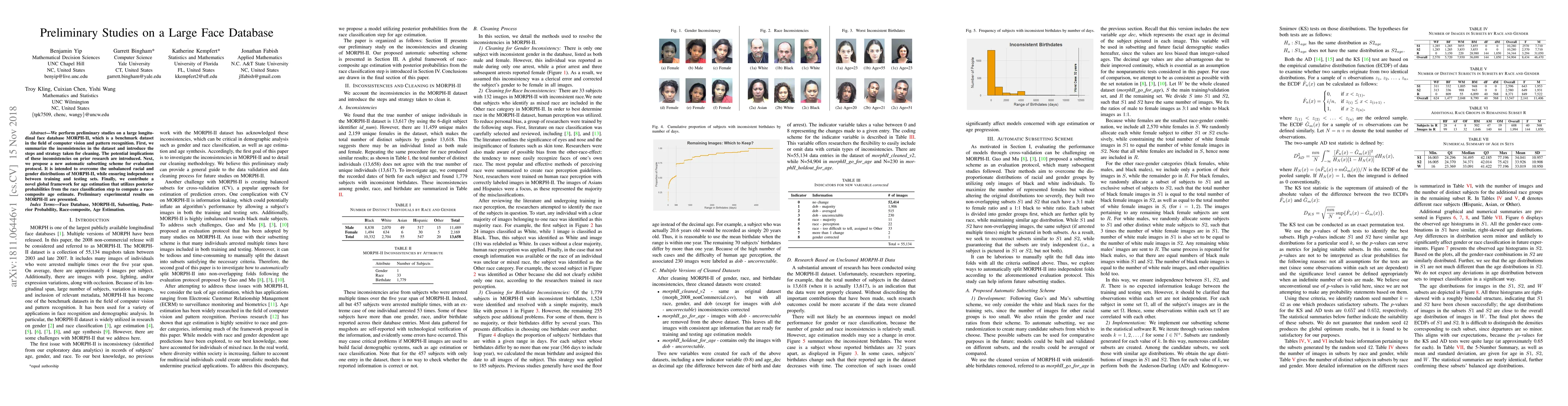 We perform preliminary studies on a large longitudinal face database MORPH-II, which is a benchmark dataset in the field of computer vision and pattern recognition. First, we summarize the inconsistencies in the dataset and introduce the steps and strategy taken for cleaning. The potential implications of these inconsistencies on prior research are introduced. Next, we propose a new automatic subsetting scheme for evaluation protocol. It is intended to overcome the unbalanced racial and gender distributions of MORPH-II, while ensuring independence between training and testing sets. Finally, we contribute a novel global framework for age estimation that utilizes posterior probabilities from the race classification step to compute a racecomposite age estimate. Preliminary experimental results on MORPH-II are presented.