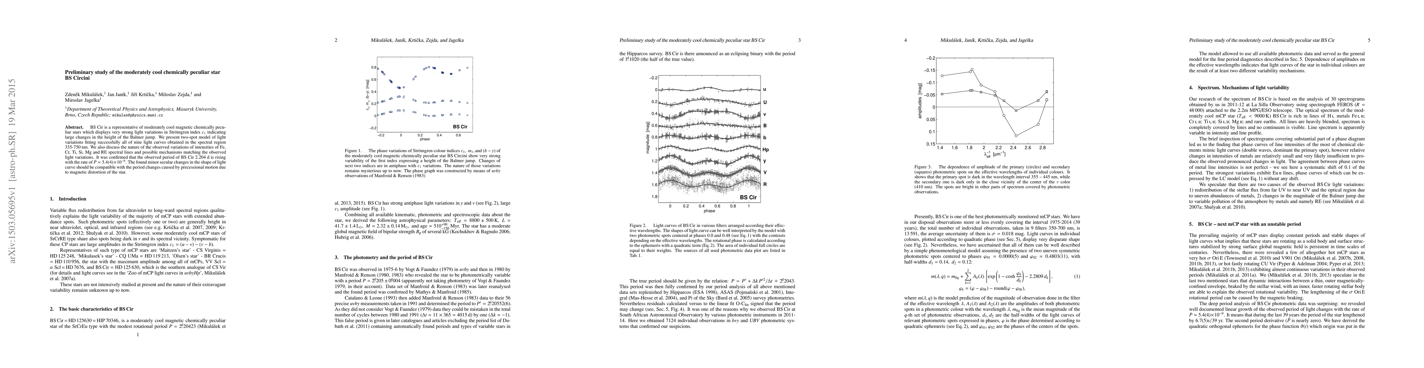 BS Cir is a representative of moderately cool magnetic chemically peculiar stars which displays very strong light variations in Stroemgren index c1 indicating large changes in the height of the Balmer jump. We present two-spot model of light variations fitting successfully all of nine light curves obtained in the spectral region 335-750 nm. We also discuss the nature of the observed variations of intensities of Fe, Cr, Ti, Si, Mg and RE spectral lines and possible mechanisms matching the observed light variations. It was confirmed that the observed period of BS Cir 2.204 d is rising with the rate of dP/dt=5.4(4)x10^-9. The found minor secular changes in the shape of light curve should be compatible with the period changes caused by precessional motion due to magnetic distortion of the star.
