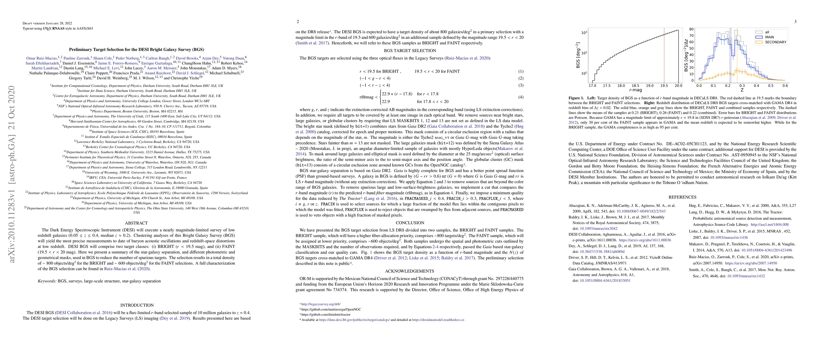 The DESI Bright Galaxy Survey (BGS) targets low redshift galaxies for precise measurements of baryon acoustic oscillations and distortions. The survey selects galaxies based on brightness, resulting in two target classes: BRIGHT ($r<19.5$~mag) and FAINT ($19.5<r<20$~mag), with densities of $\sim 800$ and $\sim 600$ objects/deg$^2$ respectively, after applying star-galaxy separation and various masks.
