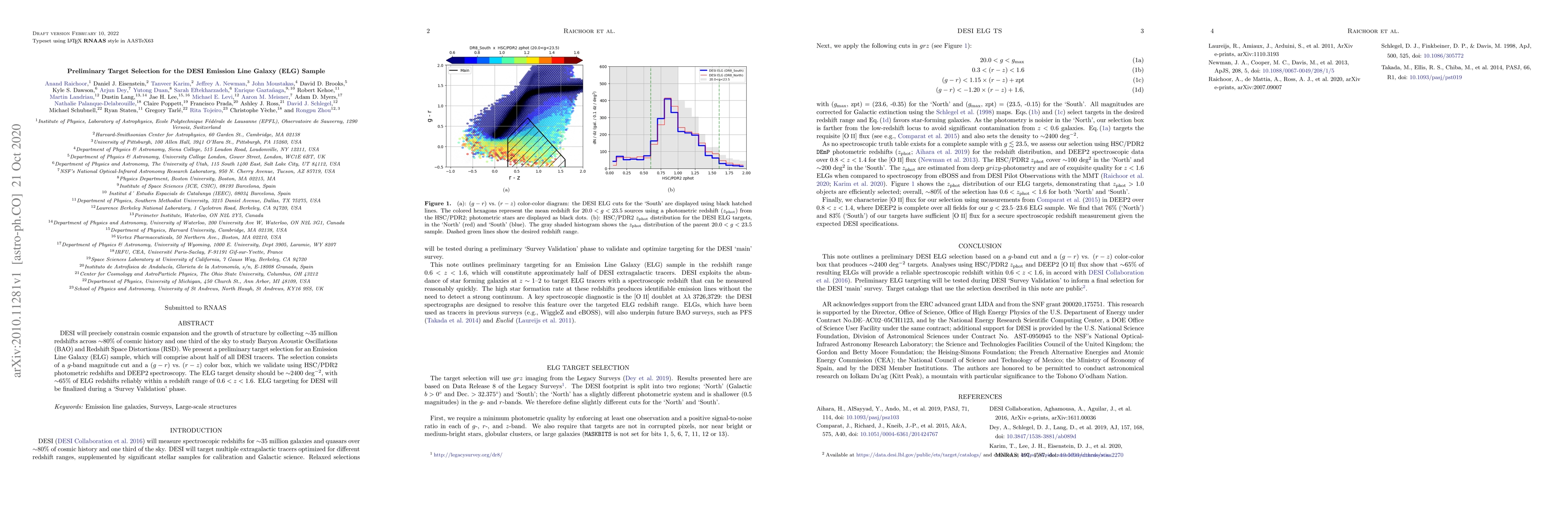 The DESI Emission Line Galaxy (ELG) sample aims to study Baryon Acoustic Oscillations and Redshift Space Distortions by selecting galaxies with a $g$-band magnitude cut and specific $(g-r)$ vs. $(r-z)$ color criteria. Preliminary selection targets approximately 2400 ELGs per square degree, with 65% of redshifts reliably within $0.6<z<1.6$.
