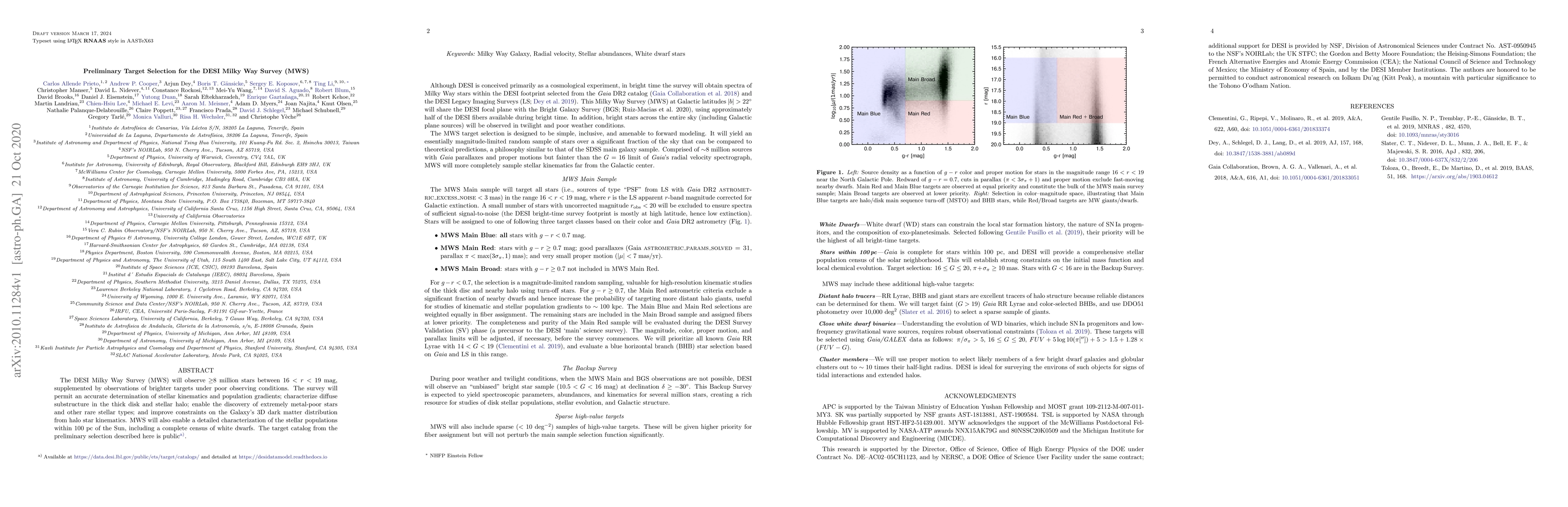 The DESI Milky Way Survey (MWS) aims to observe at least 8 million stars in the Milky Way, focusing on those with magnitudes between 16 and 19, to accurately determine stellar kinematics and population gradients. The preliminary target selection catalog is publicly available.