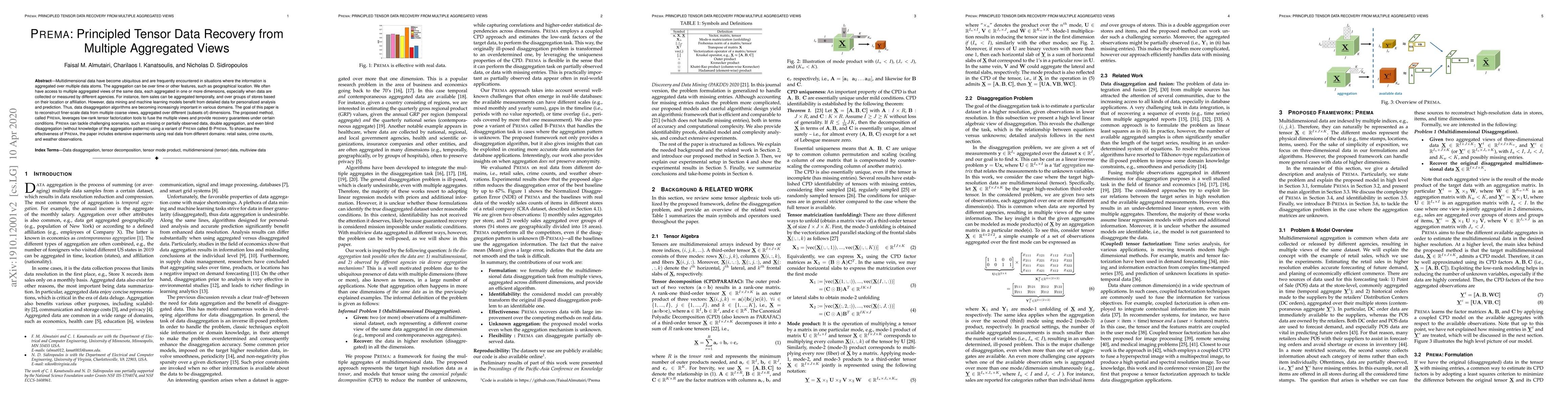 Multidimensional data have become ubiquitous and are frequently encountered in situations where the information is aggregated over multiple data atoms. The aggregation can be over time or other features, such as geographical location. We often have access to multiple aggregated views of the same data, each aggregated in one or more dimensions, especially when data are collected or measured by different agencies. For instance, item sales can be aggregated temporally, and over groups of stores based on their location or affiliation. However, data mining and machine learning models benefit from detailed data for personalized analysis and prediction. Thus, data disaggregation algorithms are becoming increasingly important in various domains. The goal of this paper is to reconstruct finer-scale data from multiple coarse views, aggregated over different (subsets of) dimensions. The proposed method, called PREMA, leverages low-rank tensor factorization tools to fuse the multiple views and provide recovery guarantees under certain conditions. PREMA can tackle challenging scenarios, such as missing or partially observed data, double aggregation, and even blind disaggregation (without knowledge of the aggregation patterns) using a variant of PREMA called B-PREMA. To showcase the effectiveness of PREMA, the paper includes extensive experiments using real data from different domains: retail sales, crime counts, and weather observations.