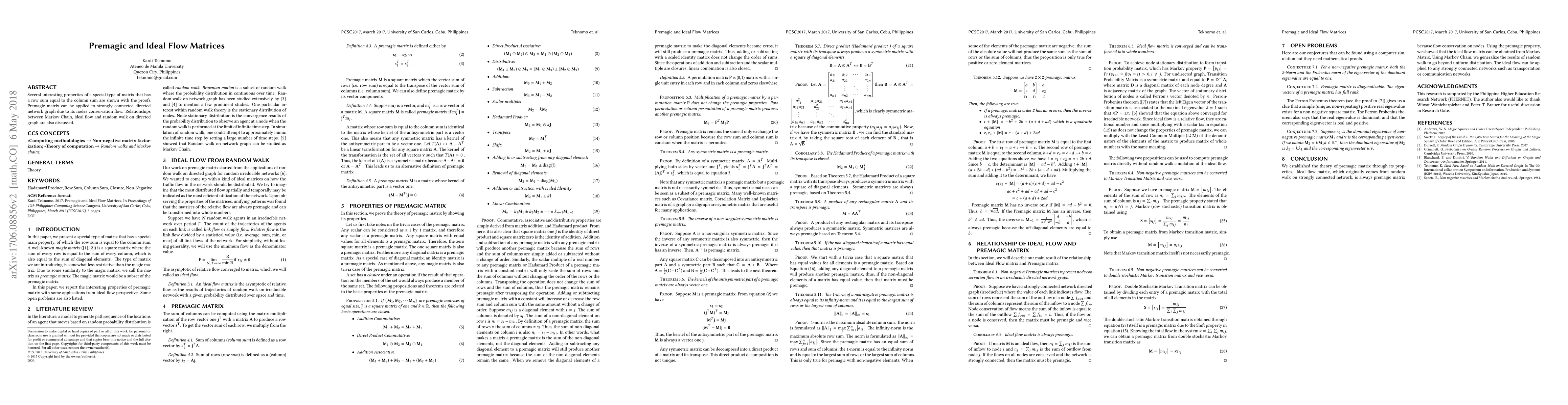 Several interesting properties of a special type of matrix that has a row sum equal to the column sum are shown with the proofs. Premagic matrix can be applied to strongly connected directed network graph due to its nodes conservation flow. Relationships between Markov Chain, ideal flow and random walk on directed graph are also discussed.