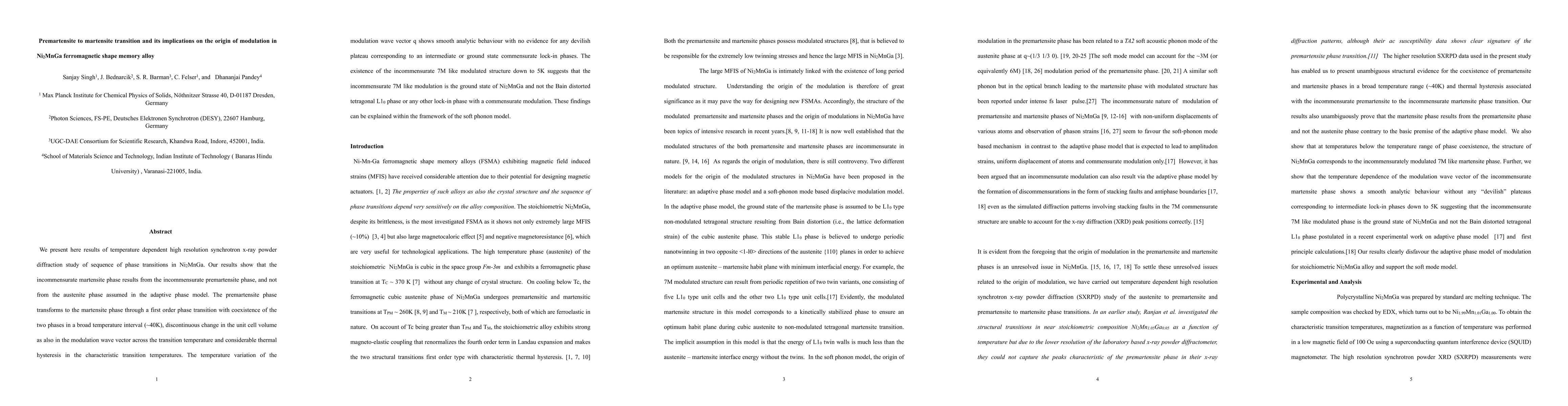 The study uses high-resolution synchrotron x-ray powder diffraction to reveal that the incommensurate martensite phase in Ni2MnGa originates from an incommensurate premartensite phase, not from the austenite phase as previously assumed. The transition between these phases is first-order, with a broad coexistence interval, volume change, and hysteresis. The modulation wave vector's temperature variation shows no evidence of commensurate lock-in phases, suggesting the incommensurate 7M structure is Ni2MnGa's ground state. These findings align with the soft phonon model.