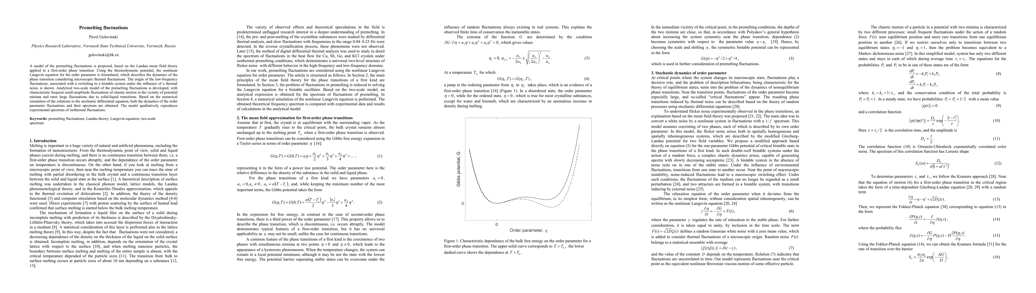 This paper proposes a model for premelting fluctuations based on Landau mean field theory, formulating a nonlinear Langevin equation to describe phase transition dynamics. It develops an analytical two-scale model that captures frequent small-amplitude fluctuations and rarer large-scale transitions, matching experimental spectra.