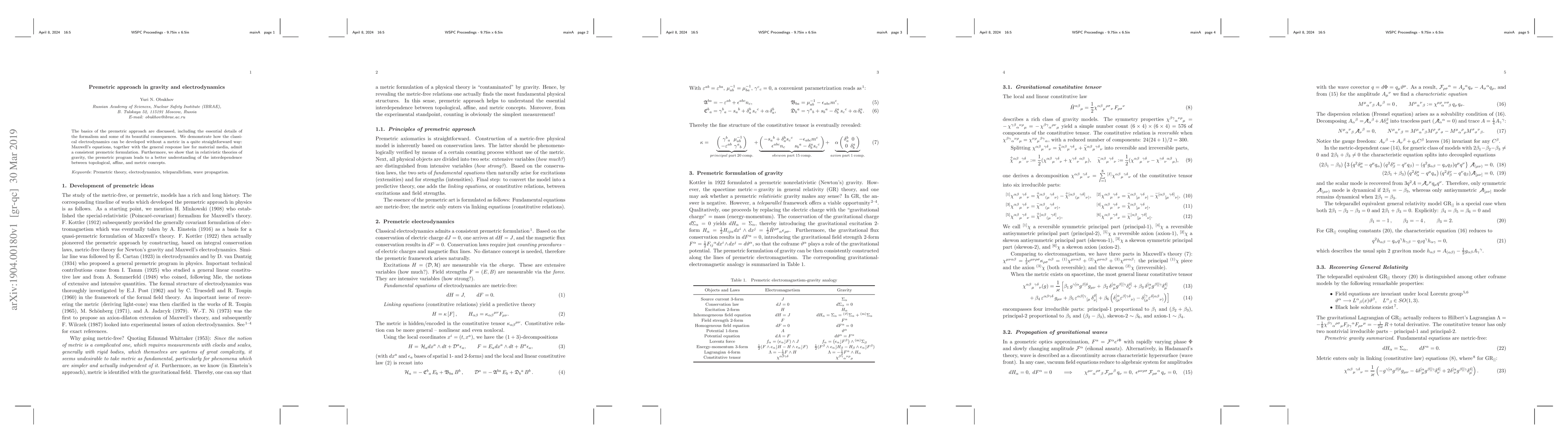 This paper explores the premetric approach in gravity and electrodynamics, demonstrating a consistent formulation of classical electrodynamics without relying on a metric. It also highlights the premetric program's role in enhancing the understanding of the relationships between topological, affine, and metric concepts in relativistic gravity theories.