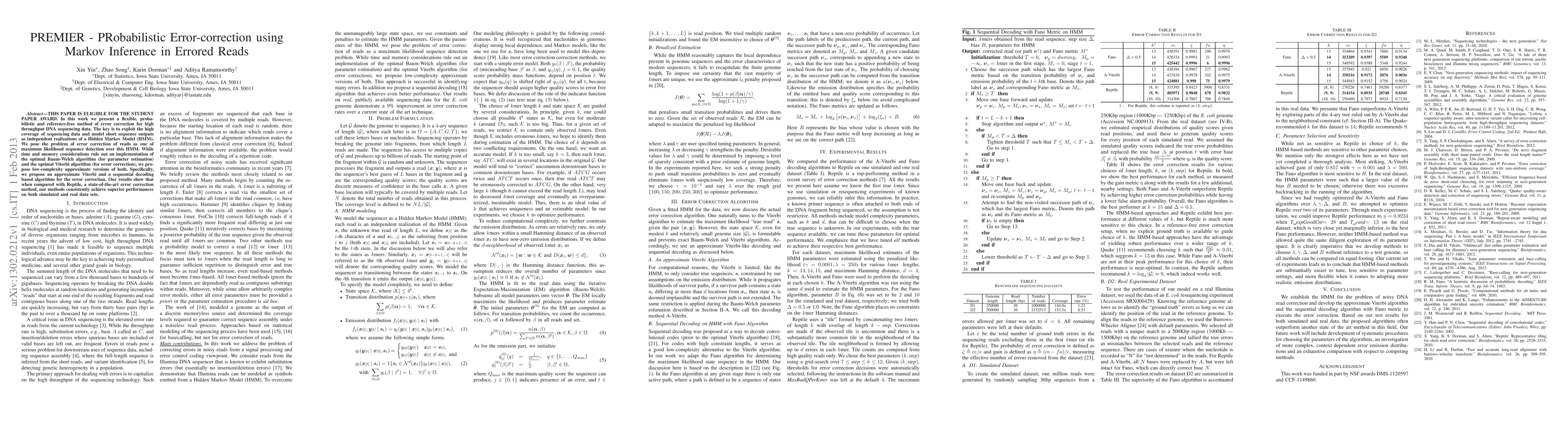 In this work we present a flexible, probabilistic and reference-free method of error correction for high throughput DNA sequencing data. The key is to exploit the high coverage of sequencing data and model short sequence outputs as independent realizations of a Hidden Markov Model (HMM). We pose the problem of error correction of reads as one of maximum likelihood sequence detection over this HMM. While time and memory considerations rule out an implementation of the optimal Baum-Welch algorithm (for parameter estimation) and the optimal Viterbi algorithm (for error correction), we propose low-complexity approximate versions of both. Specifically, we propose an approximate Viterbi and a sequential decoding based algorithm for the error correction. Our results show that when compared with Reptile, a state-of-the-art error correction method, our methods consistently achieve superior performances on both simulated and real data sets.