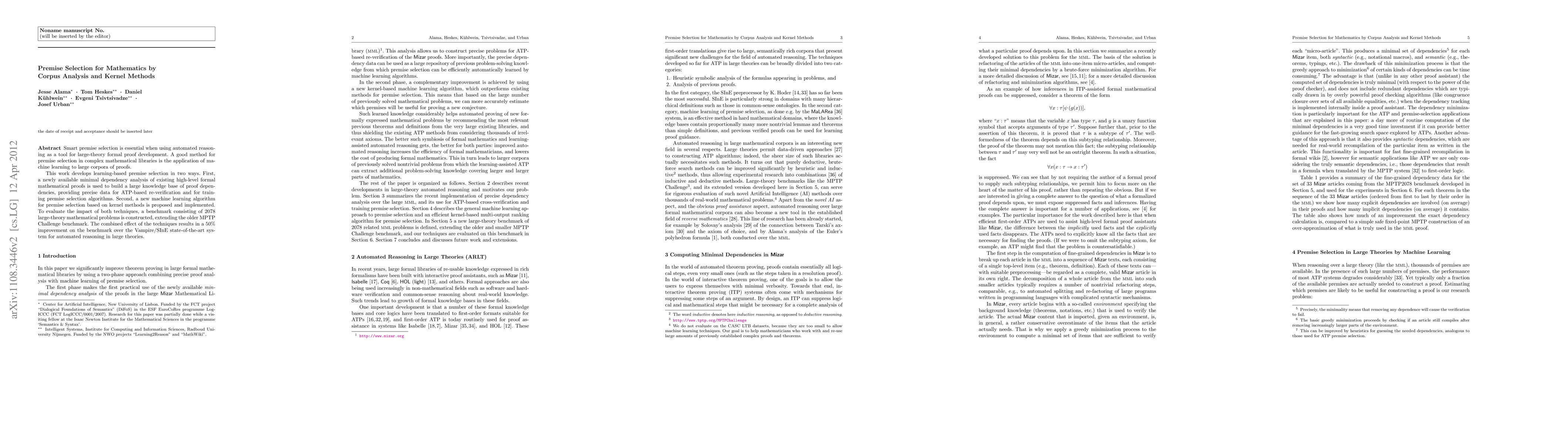This paper develops a machine learning approach for automated premise selection in large-theory formal proof development, leveraging a new knowledge base from minimal dependency analysis and a kernel-based machine learning algorithm. The proposed methods achieve a 50% improvement over existing automated reasoning systems on a benchmark of 2078 mathematical problems.