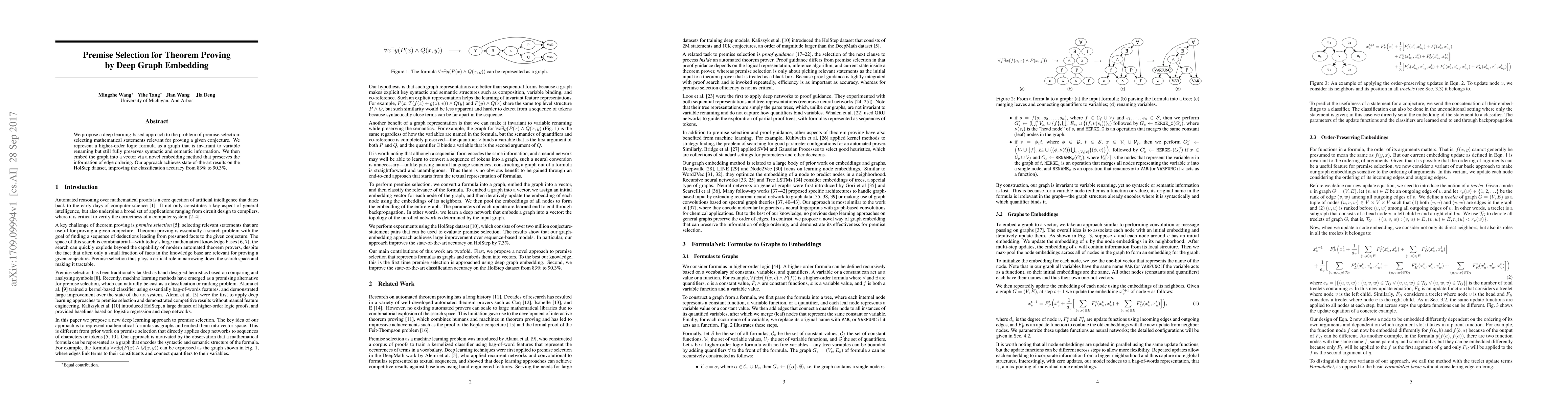 This paper introduces a deep learning technique for selecting relevant mathematical statements to prove conjectures by embedding higher-order logic formulas as invariant graphs, achieving a significant improvement in classification accuracy on the HolStep dataset.