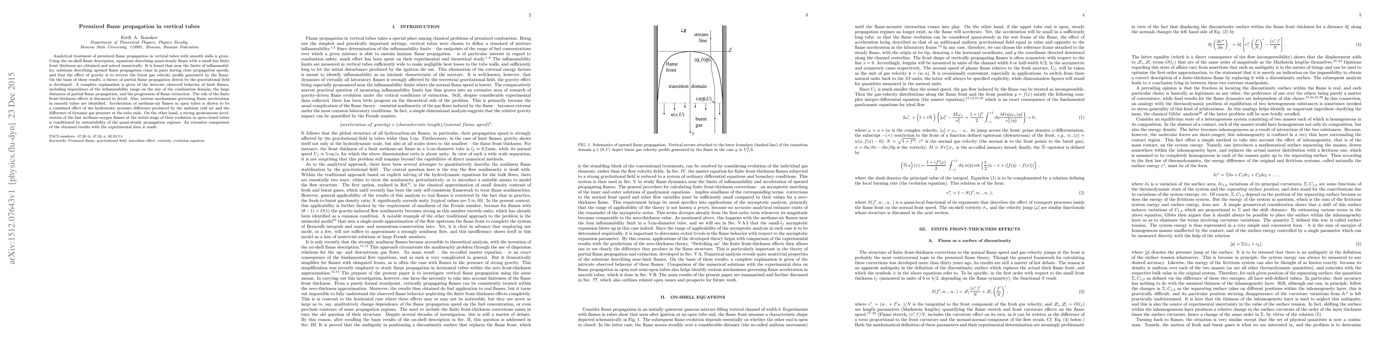 This paper analytically investigates premixed flame propagation in vertical tubes, revealing that near inflammability limits, flame propagation solutions occur in pairs with similar speeds. The study develops a theory explaining partial flame propagation driven by gravity, detailing the mechanisms of flame acceleration and comparing theoretical findings with experimental data.