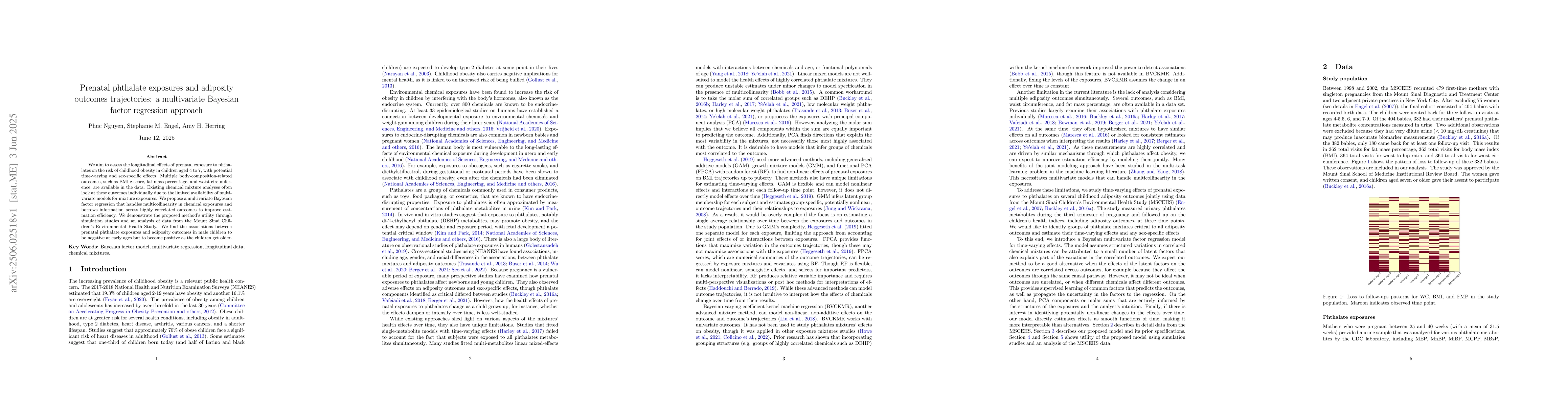 The research employs a multivariate Bayesian factor regression approach to analyze prenatal phthalate exposures and their longitudinal effects on childhood adiposity outcomes, handling multicollinearity in chemical exposures and borrowing information across correlated outcomes.