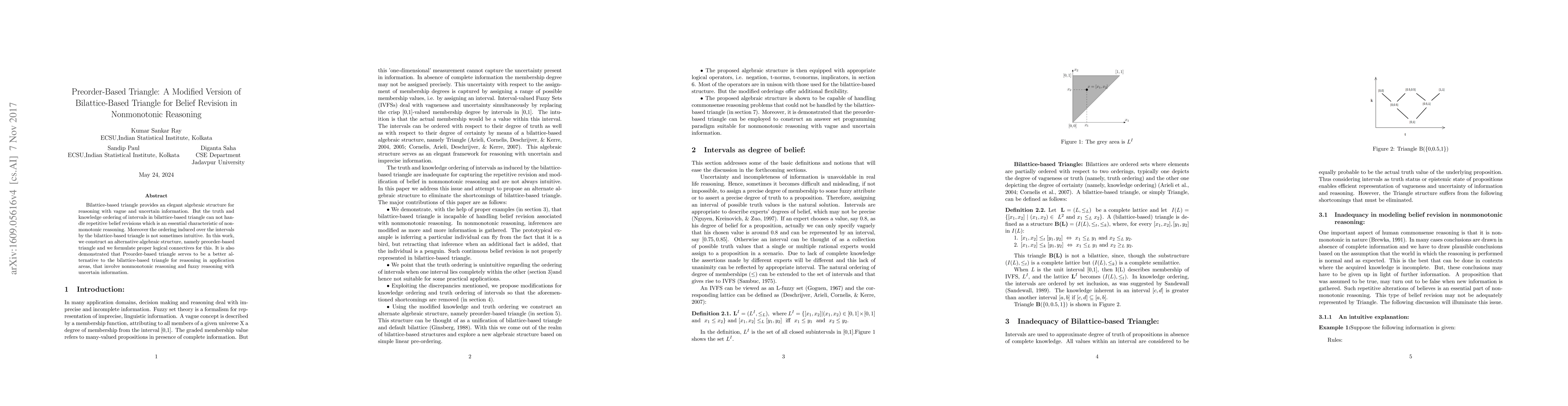 Bilattice-based triangle provides an elegant algebraic structure for reasoning with vague and uncertain information. But the truth and knowledge ordering of intervals in bilattice-based triangle can not handle repetitive belief revisions which is an essential characteristic of nonmonotonic reasoning. Moreover the ordering induced over the intervals by the bilattice-based triangle is not sometimes intuitive. In this work, we construct an alternative algebraic structure, namely preorder-based triangle and we formulate proper logical connectives for this. It is also demonstrated that Preorder-based triangle serves to be a better alternative to the bilattice-based triangle for reasoning in application areas, that involve nonmonotonic fuzzy reasoning with uncertain information.