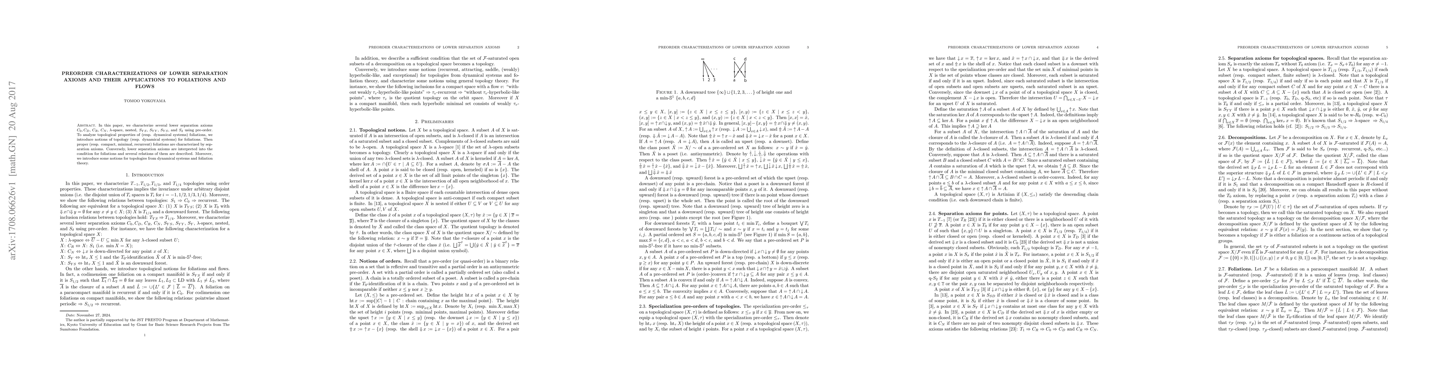 Researchers characterize various lower separation axioms using pre-order and apply them to foliations and flows, introducing new topological notions for these spaces.