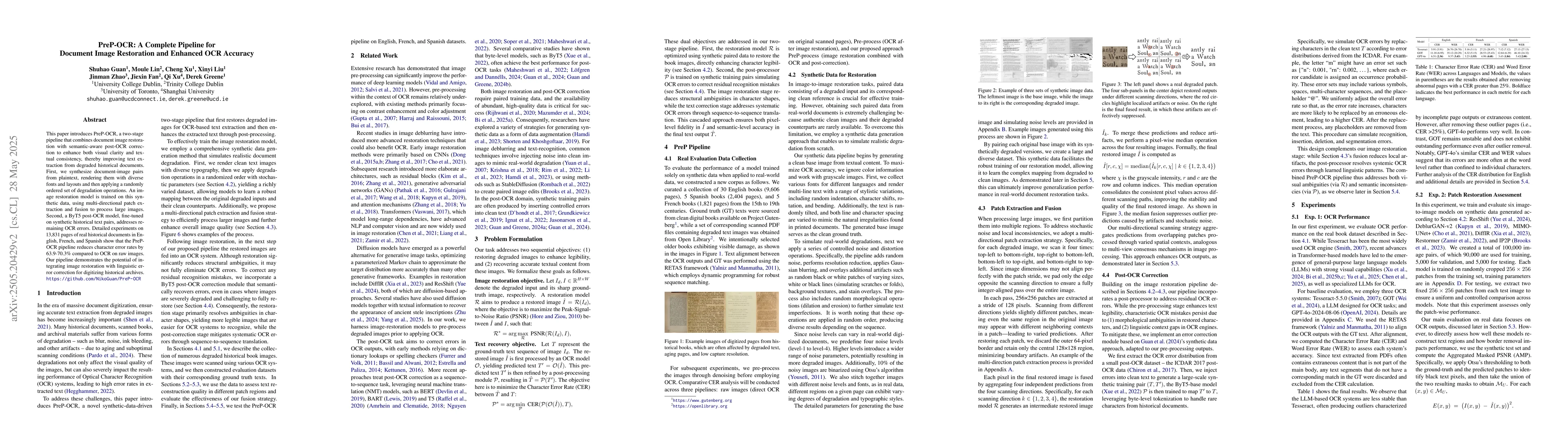A new pipeline called PreP-OCR improves text extraction from degraded historical documents by combining image restoration with post-OCR correction, reducing character error rates by 63.9-70.3%.