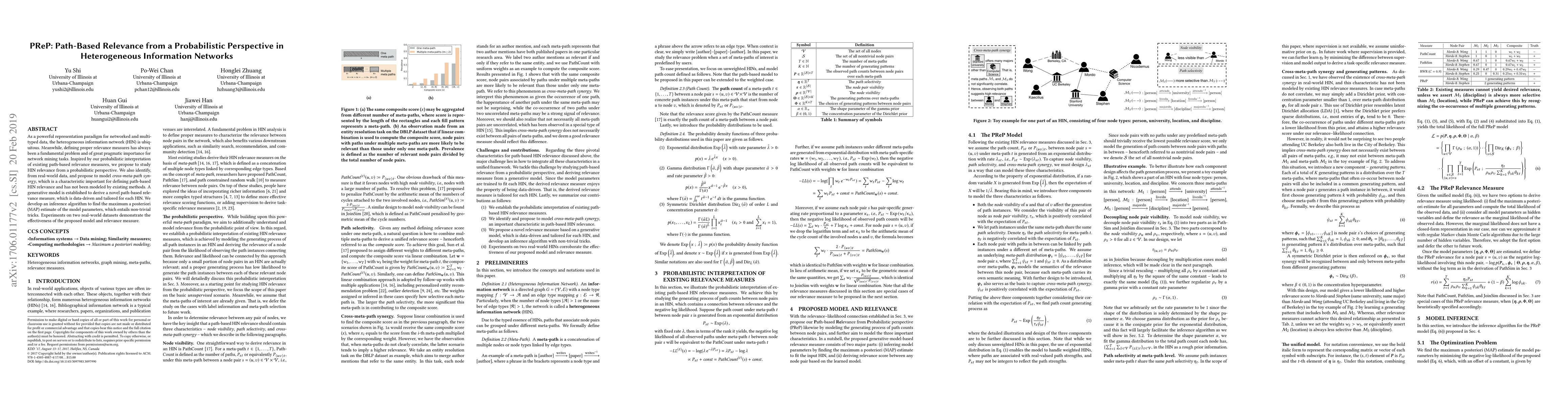 This paper proposes a probabilistic framework for defining path-based relevance in heterogeneous information networks (HINs), introducing a generative model to capture cross-meta-path synergy. The developed inference algorithm efficiently estimates model parameters, and experiments show the effectiveness of the new relevance measure on real-world datasets.