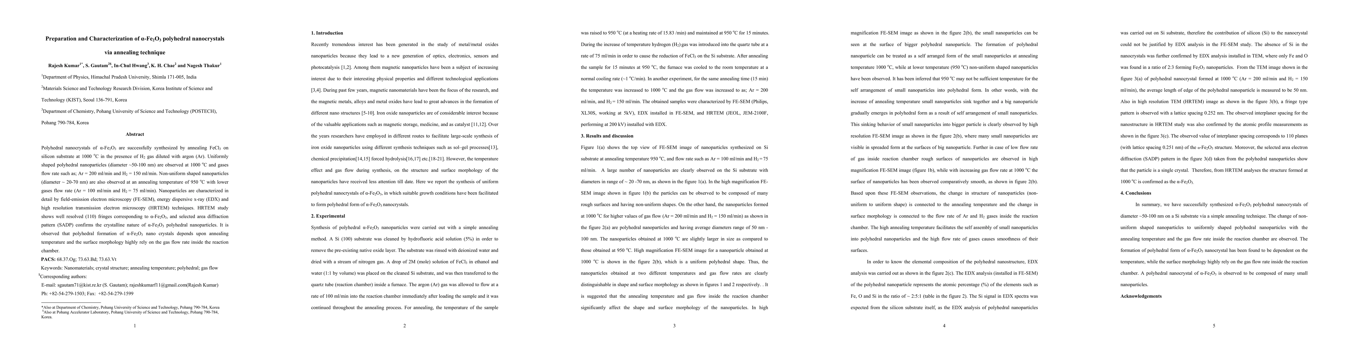 This paper details the synthesis of polyhedral α-Fe2O3 nanocrystals via annealing FeCl3 at varying temperatures and gas flow rates, followed by detailed characterization using FE-SEM, EDX, and HRTEM, revealing the dependence of nanoparticle shape and size on annealing conditions.