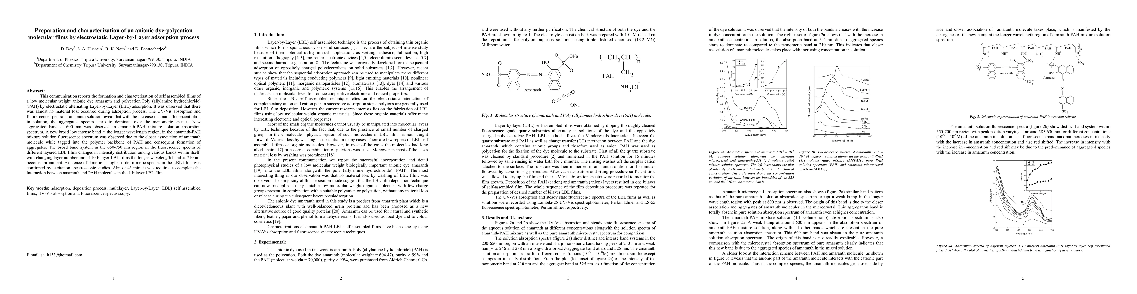 This paper details the formation and characterization of self-assembled films using anionic dye amaranth and polycation PAH via Layer-by-Layer adsorption, revealing significant spectral changes and aggregation behavior with increasing dye concentration. The study highlights the prominent longer wavelength band at 710 nm in 10 bilayer films, indicating the formation of dimeric or higher order species.