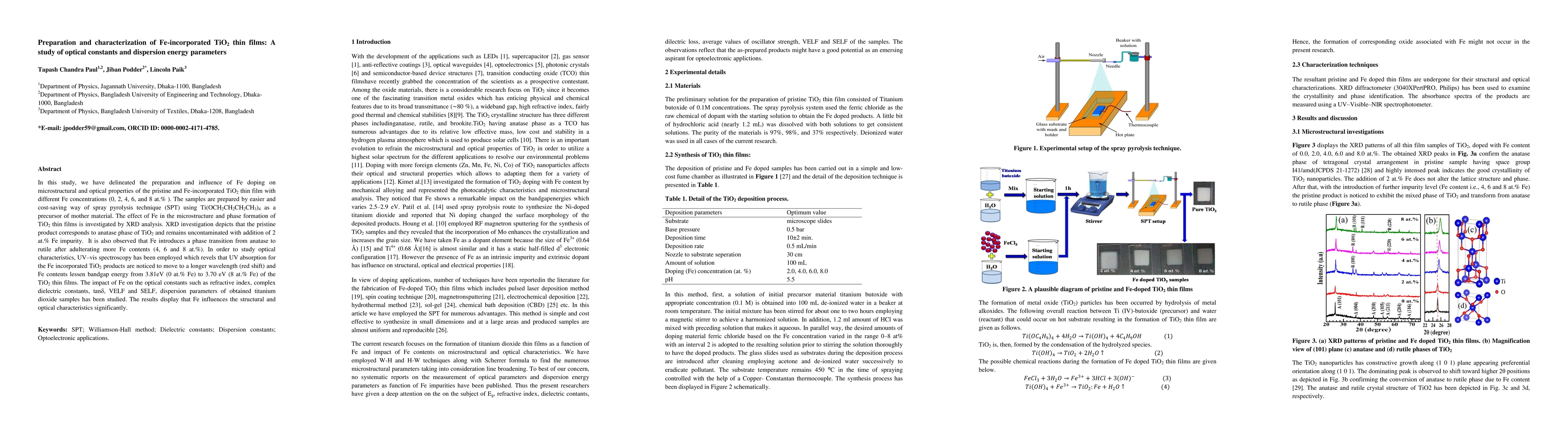 In this study, we have delineated the preparation and influence of Fe doping on microstructural and optical properties of the pristine and Fe incorporated TiO$_2$ thin film with different Fe concentrations (0, 2, 4, 6, and 8 at.% ). The samples are prepared by easier and cost-saving way of spray pyrolysis technique (SPT) using Ti(OCH$_2$CH$_2$CH$_2$CH$_3$)$_4$ as a precursor of mother material. The effect of Fe in the microstructure and phase formation of TiO$_2$ thin films is investigated by XRD analysis. XRD investigation depicts that the pristine product corresponds to anatase phase of TiO$_2$ and remains uncontaminated with addition of 2 at.% Fe impurity. It is also observed that Fe introduces a phase transition from anatase to rutile after adulterating more Fe contents (4, 6 and 8 at.%). In order to study optical characteristics, UVvis spectroscopy has been employed which revels that UV absorption for the Fe incorporated TiO$_2$ products are noticed to move to a longer wavelength (red shift) and Fe contents lessen bandgap energy from 3.81eV (0 at.% Fe) to 3.70 eV (8 at.% Fe) of the TiO$_2$ thin films. The impact of Fe on the optical constants such as refractive index, complex dielectric constants, $\tan\delta$, VELF and SELF, dispersion parameters of obtained titanium dioxide samples has been studied. The results display that Fe influences the structural and optical characteristics significantly.