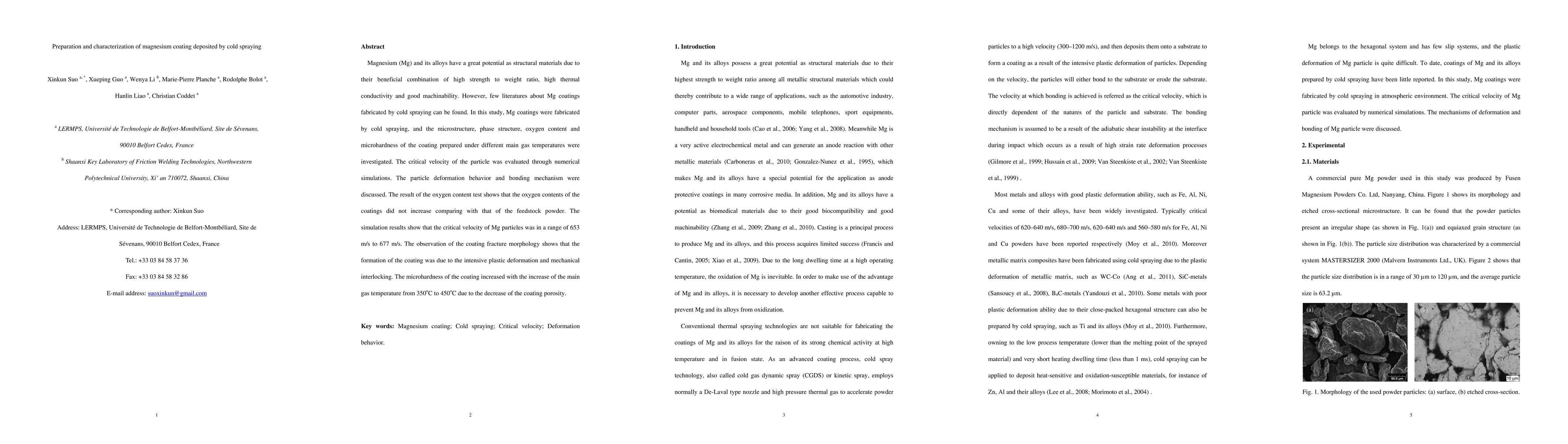Magnesium (Mg) and its alloys have a great potential as structural materials due to their beneficial combination of high strength to weight ratio, high thermal conductivity and good machinability. However, few literatures about Mg coatings fabricated by cold spraying can be found. In this study, Mg coatings were fabricated by cold spraying, and the microstructure, phase structure, oxygen content and microhardness of the coating prepared under different main gas temperatures were investigated. The critical velocity of the particle was evaluated through numerical simulations. The particle deformation behavior and bonding mechanism were discussed. The result of the oxygen content test shows that the oxygen contents of the coatings did not increase comparing with that of the feedstock powder. The simulation results show that the critical velocity of Mg particles was in a range of 653 m/s to 677 m/s. The observation of the coating fracture morphology shows that the formation of the coating was due to the intensive plastic deformation and mechanical interlocking. The microhardness of the coating increased with the increase of the main gas temperature from 350oC to 450oC due to the decrease of the coating porosity.