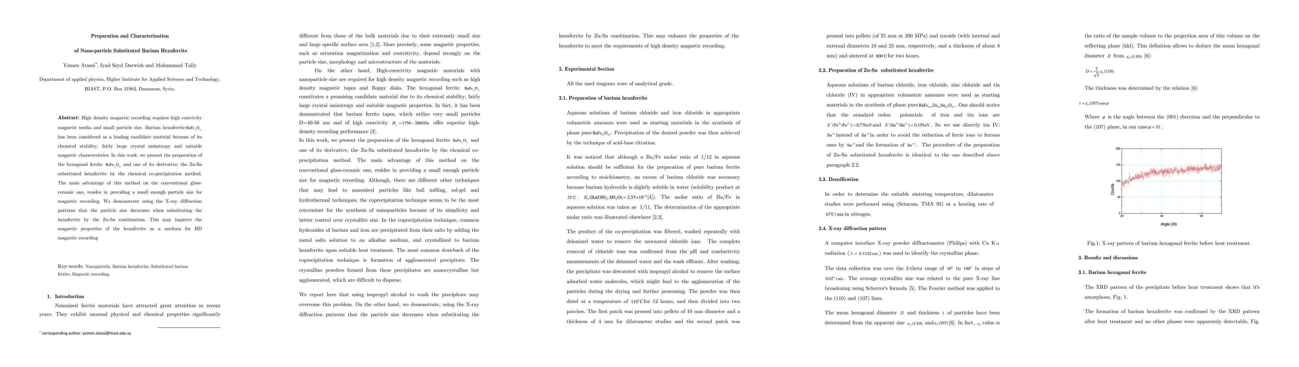 This research paper details the preparation of Zn-Sn substituted barium hexaferrite nanoparticles using a chemical co-precipitation method, which results in smaller particle sizes compared to conventional methods. Enhanced particle size reduction is shown to potentially improve magnetic properties, making it a promising candidate for high-density magnetic recording.