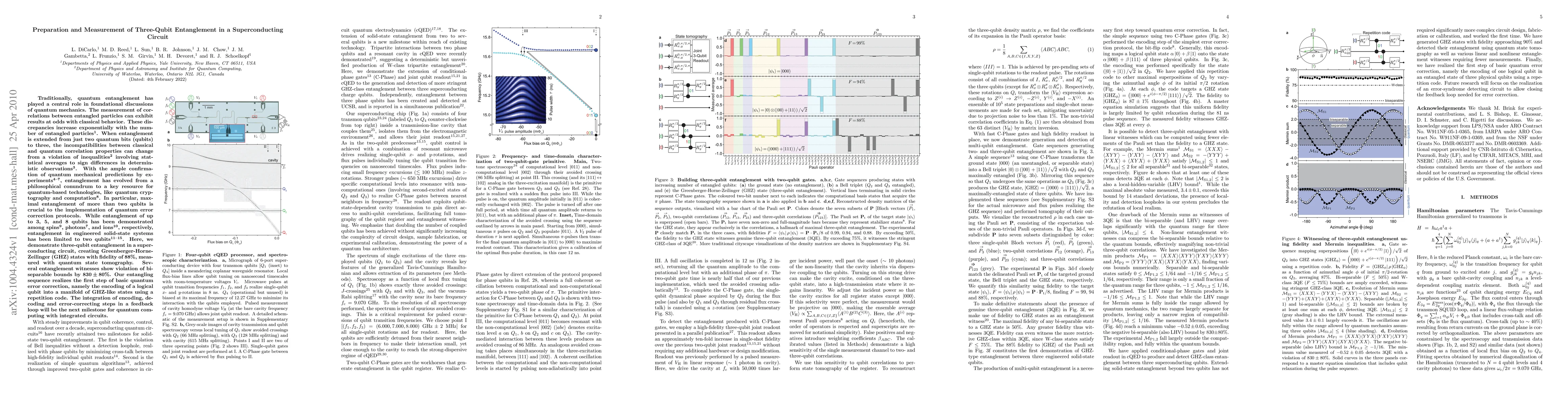This paper demonstrates the creation and measurement of three-qubit entanglement in a superconducting circuit, achieving GHZ states with 88% fidelity. The study shows significant violation of bi-separable bounds, marking a crucial step towards quantum error correction and advancing quantum computing technologies.