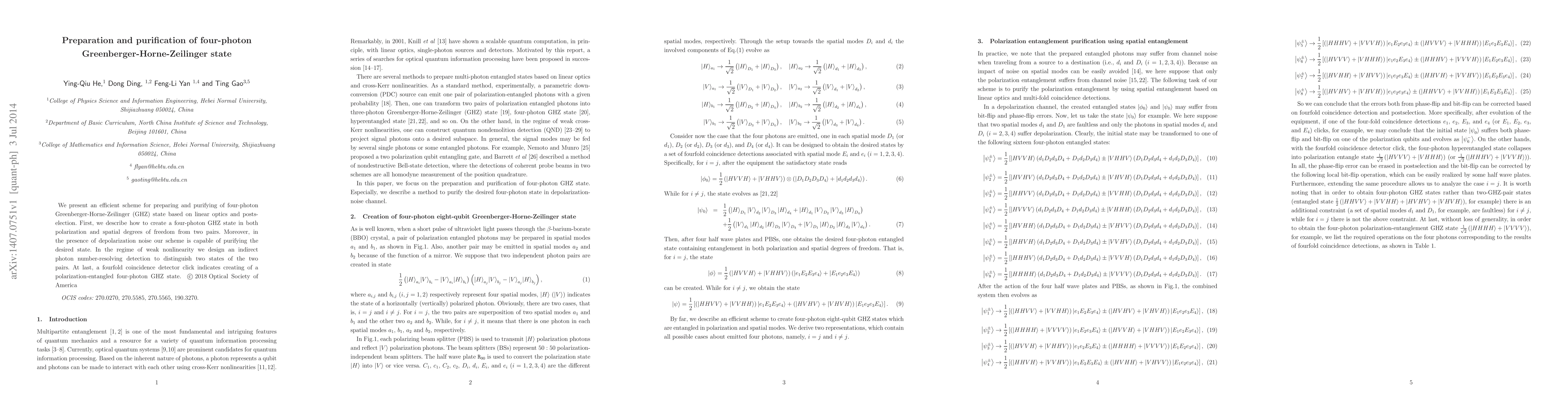 This paper proposes an efficient method for preparing and purifying four-photon Greenberger-Horne-Zeilinger (GHZ) states using linear optics and postselection. The scheme can create and purify these states in both polarization and spatial degrees of freedom, even in the presence of depolarization noise, and employs photon number-resolving detection for weak nonlinearity.