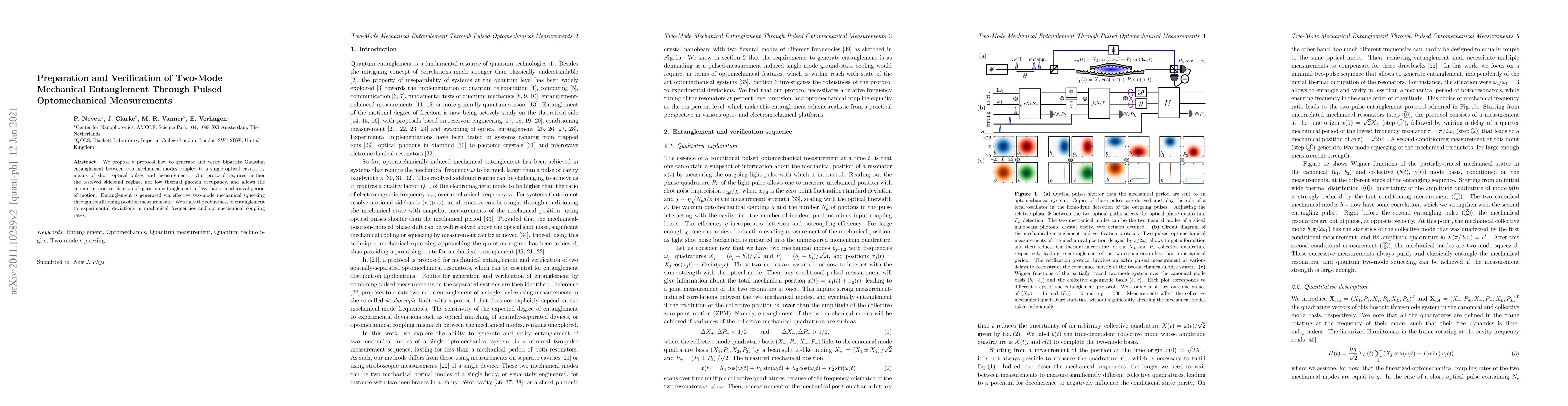 This paper proposes a protocol to generate and verify bipartite Gaussian entanglement between two mechanical modes in an optomechanical system using short optical pulses. The method does not require the resolved sideband regime or low thermal phonon occupancy, allowing for entanglement generation and verification in less than a mechanical period, with robustness studied against experimental deviations.