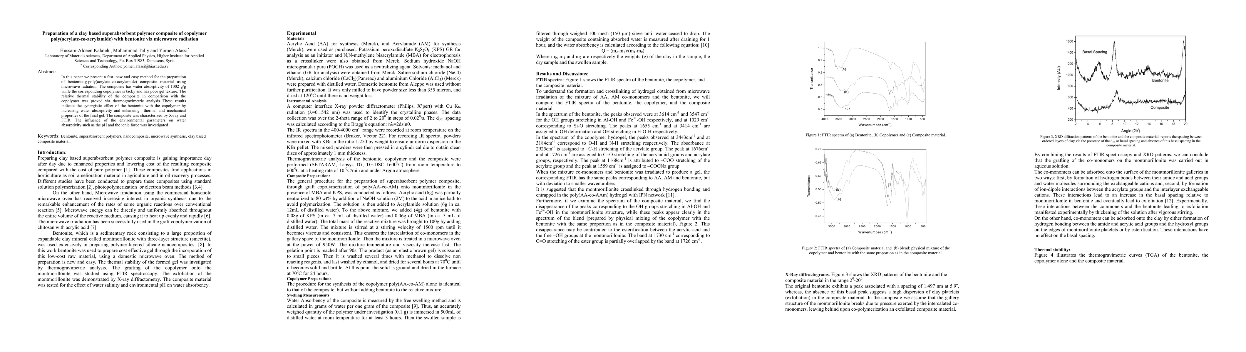 In this paper we present a fast, new and easy method for the preparation of bentonite-g-poly(acrylate-co-acrylamide) composite material using microwave radiation. The composite has water absorptivity of 1002 g/g while the corresponding copolymer is tacky and has poor gel texture. The relative thermal stability of the composite in comparison with the copolymer was proved via thermogravimetric analysis These results indicate the synergistic effect of the bentonite with the copolymer by increasing water absorptivity and enhancing thermal and mechanical properties of the final gel. The composite was characterized by X-ray and FTIR. The influence of the environmental parameters on water absorptivity such as the pH and the ionic force was investigated