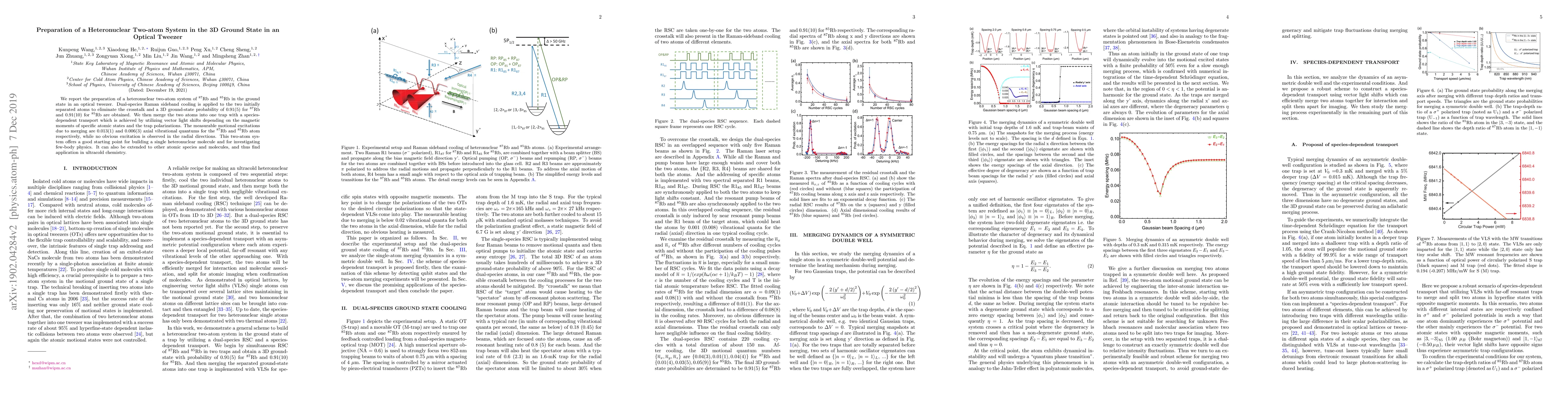 This research realizes a heteronuclear two-atom system of $^{87}$Rb-$^{85}$Rb in the 3D motional ground state using optical tweezers, achieving 3D Raman sideband cooling and merging the atoms with minimal crosstalk. The potential applications include cold collision studies, quantum logic, and ultracold chemistry.