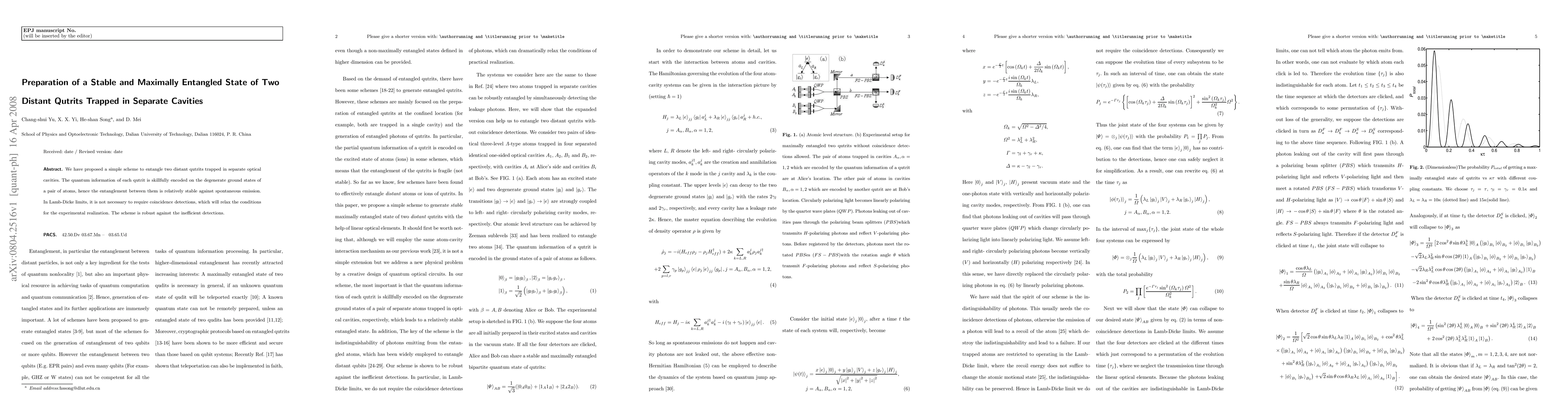 This paper proposes a method to create a stable entangled state between two distant qutrits in separate optical cavities, encoding quantum information using degenerate ground states of atoms, which enhances stability against spontaneous emission. The scheme operates effectively under Lamb-Dicke limits without needing coincidence detections, simplifying experimental conditions.