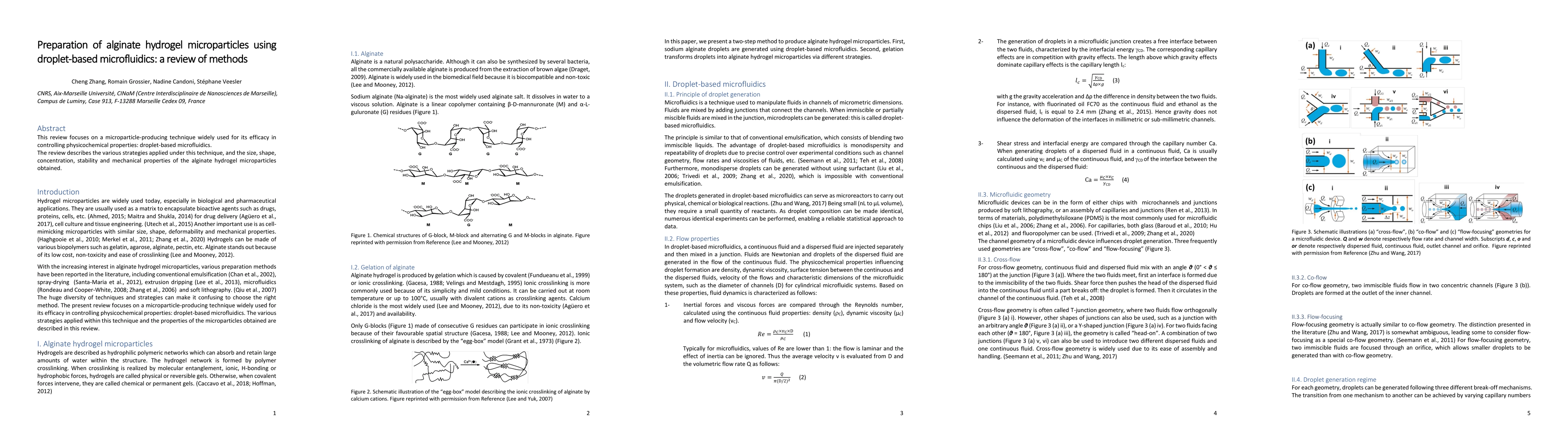This review focuses on a microparticle-producing technique widely used for its efficacy in controlling physicochemical properties: droplet-based microfluidics. The review describes the various strategies applied under this technique, and the size, shape, concentration, stability and mechanical properties of the alginate hydrogel microparticles obtained.