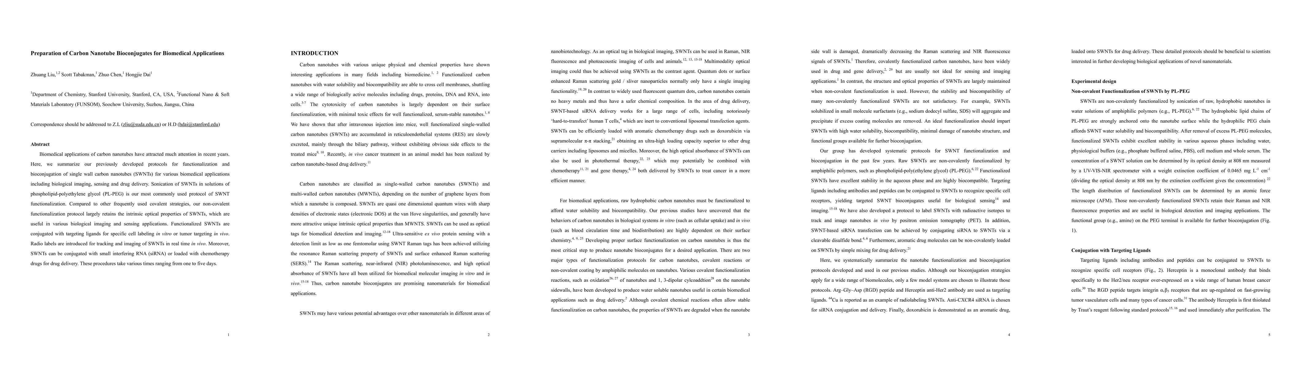 This paper outlines protocols for the functionalization and bioconjugation of single-walled carbon nanotubes (SWNTs) using non-covalent methods, which preserve SWNTs' optical properties for imaging and sensing. The SWNTs are conjugated with targeting ligands and radio labels for in vivo tracking and drug delivery applications.