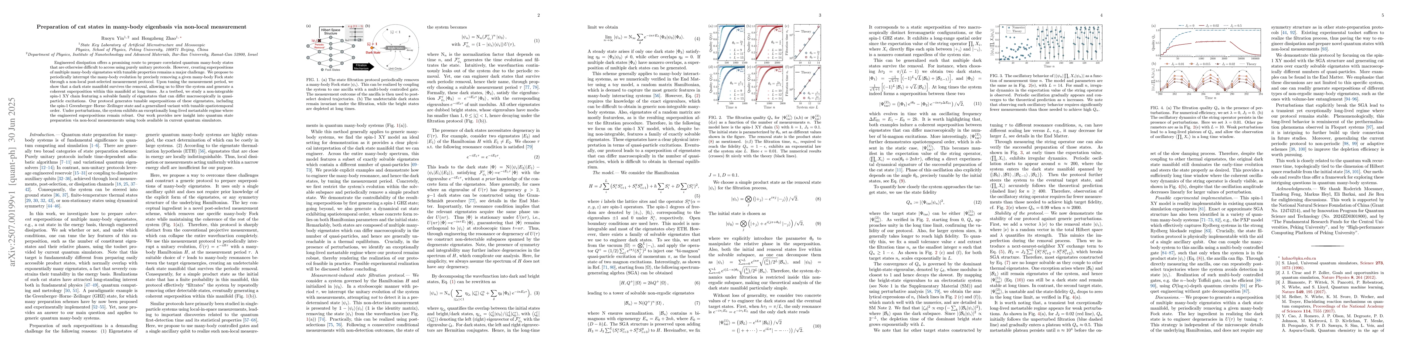 Engineered dissipation offers a promising route to prepare correlated quantum many-body states that are otherwise difficult to access using purely unitary protocols. However, creating superpositions of multiple many-body eigenstates with tunable properties remains a major challenge. We propose to periodically interrupt the many-body evolution by precisely removing a given many-body Fock state through a non-local post-selected measurement protocol. Upon tuning the measurement period, we show that a dark state manifold survives the removal, allowing us to filter the system and generate a coherent superposition within this manifold at long times. As a testbed, we study a non-integrable spin-1 XY chain featuring a solvable family of eigenstates that can differ macroscopically in quasi-particle excitations. Our protocol generates tunable superpositions of these eigenstates, including the spin-1 Greenberger-Horne-Zeilinger state and a generalized variant with tunable spatiotemporal order. Under perturbations, the system exhibits an exceptionally long-lived metastable regime where the engineered superpositions remain robust. Our work provides new insight into quantum state preparation via non-local measurements using tools available in current quantum simulators.
