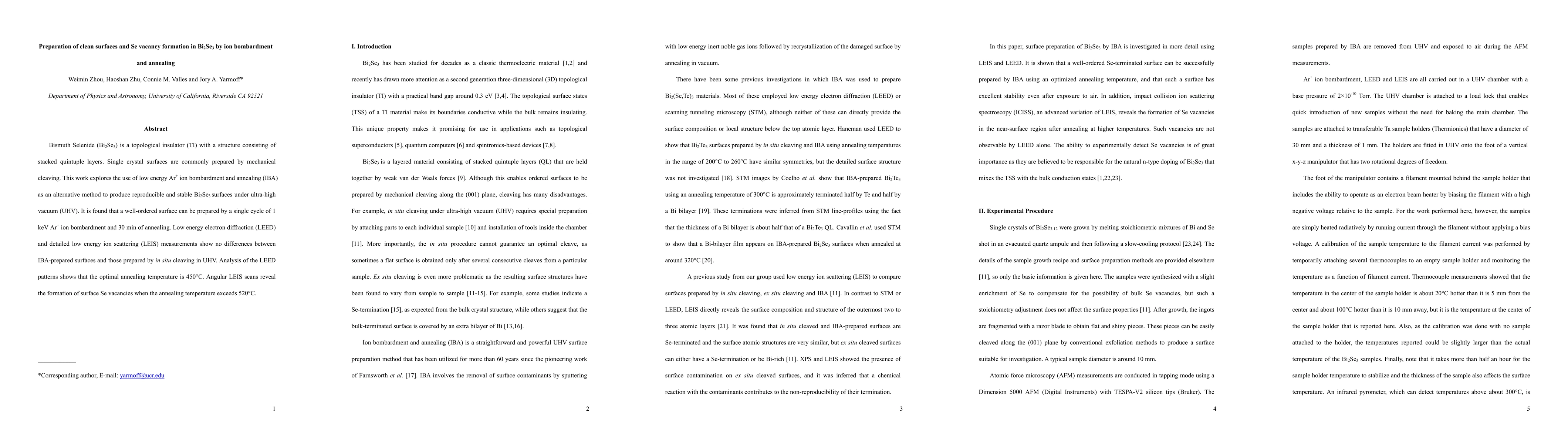 Bismuth Selenide (Bi$_{2}$Se$_{3}$) is a topological insulator (TI) with a structure consisting of stacked quintuple layers. Single crystal surfaces are commonly prepared by mechanical cleaving. This work explores the use of low energy Ar$^{+}$ ion bombardment and annealing (IBA) as an alternative method to produce reproducible and stable Bi$_{2}$Se$_{3}$ surfaces under ultra-high vacuum (UHV). It is found that a well-ordered surface can be prepared by a single cycle of 1 keV Ar$^{+}$ ion bombardment and 30 min of annealing. Low energy electron diffraction (LEED) and detailed low energy ion scattering (LEIS) measurements show no differences between IBA-prepared surfaces and those prepared by $\textit{in situ}$ cleaving in UHV. Analysis of the LEED patterns shows that the optimal annealing temperature is 450{\deg}C. Angular LEIS scans reveal the formation of surface Se vacancies when the annealing temperature exceeds 520{\deg}C.