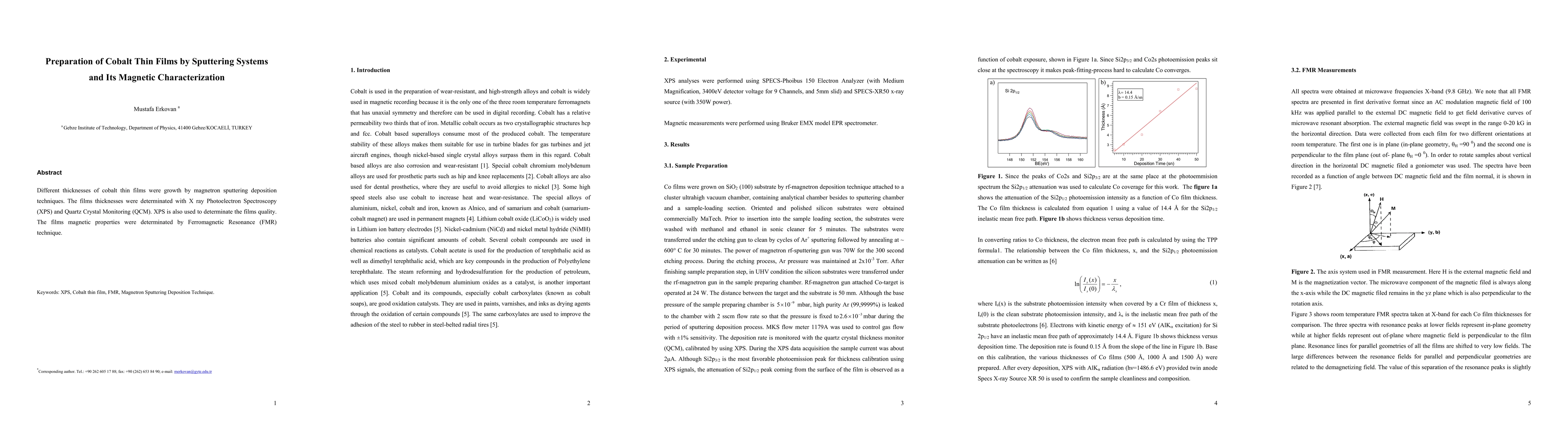 Different thicknesses of cobalt thin films were growth by magnetron sputtering deposition techniques. The films thicknesses were determinated with X ray Photoelectron Spectroscopy (XPS) and Quartz Crystal Monitoring (QCM). XPS is also used to determinate the films quality. The films magnetic properties were determinated by Ferromagnetic Resonance (FMR) technique.