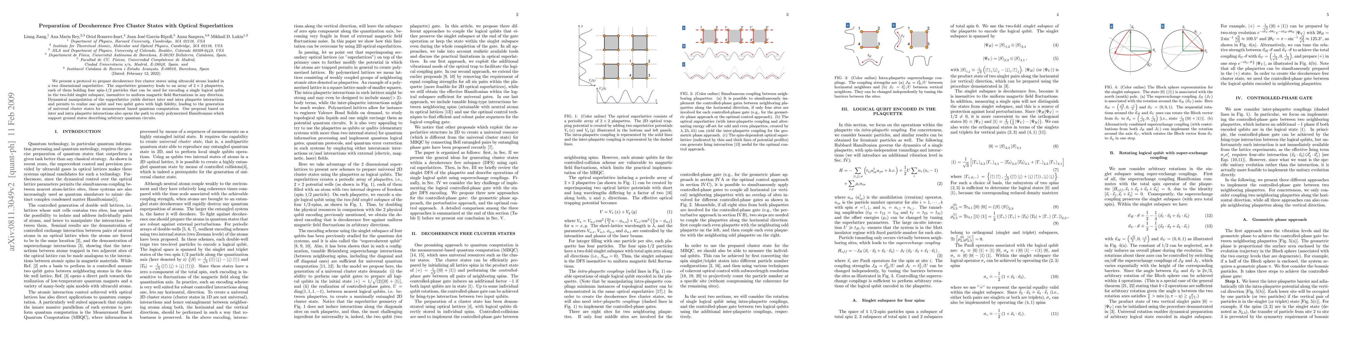 We present a protocol to prepare decoherence free cluster states using ultracold atoms loaded in a two dimensional superlattice. The superlattice geometry leads to an array of 2*2 plaquettes, each of them holding four spin-1/2 particles that can be used for encoding a single logical qubit in the two-fold singlet subspace, insensitive to uniform magnetic field fluctuations in any direction. Dynamical manipulation of the supperlattice yields distinct inter and intra plaquette interactions and permits to realize one qubit and two qubit gates with high fidelity, leading to the generation of universal cluster states for measurement based quantum computation. Our proposal based on inter and intra plaquette interactions also opens the path to study polymerized Hamiltonians which support ground states describing arbitrary quantum circuits.