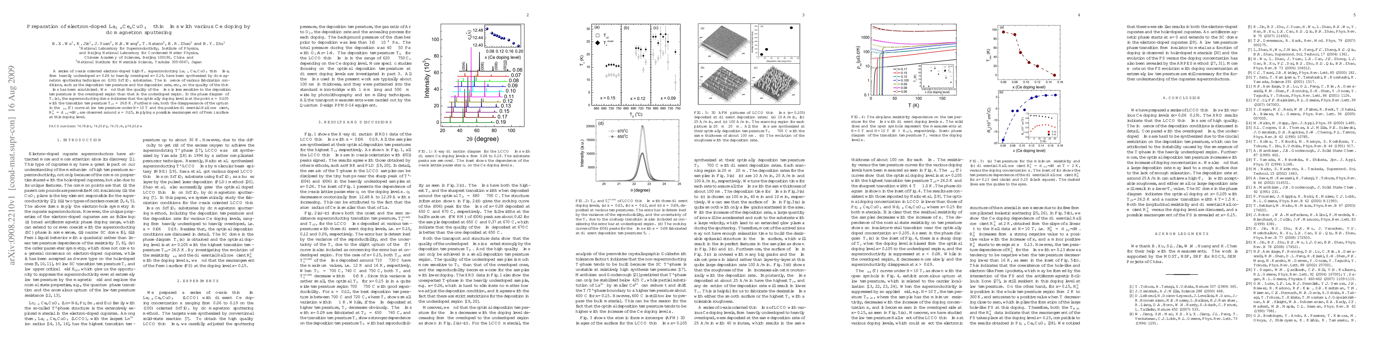 This paper details the synthesis of electron-doped La(2-x)CexCuO4 thin films via dc magnetron sputtering, exploring the effects of doping levels and fabrication conditions on film quality. The optimal superconducting transition temperature of 26.5 K is found at x=0.105, with significant changes in electronic properties observed around x=0.15.