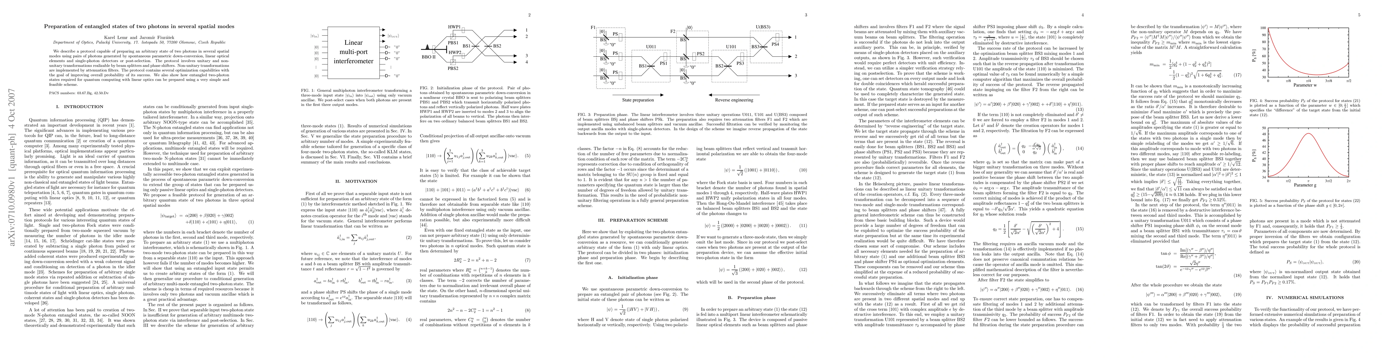 We describe a protocol capable of preparing an arbitrary state of two photons in several spatial modes using pairs of photons generated by spontaneous parametric down-conversion, linear optical elements and single-photon detectors or post-selection. The protocol involves unitary and non-unitary transformations realizable by beam splitters and phase shifters. Non-unitary transformations are implemented by attenuation filters. The protocol contains several optimization capabilities with the goal of improving overall probability of its success. We also show how entangled two-photon states required for quantum computing with linear optics can be prepared using a very simple and feasible scheme.