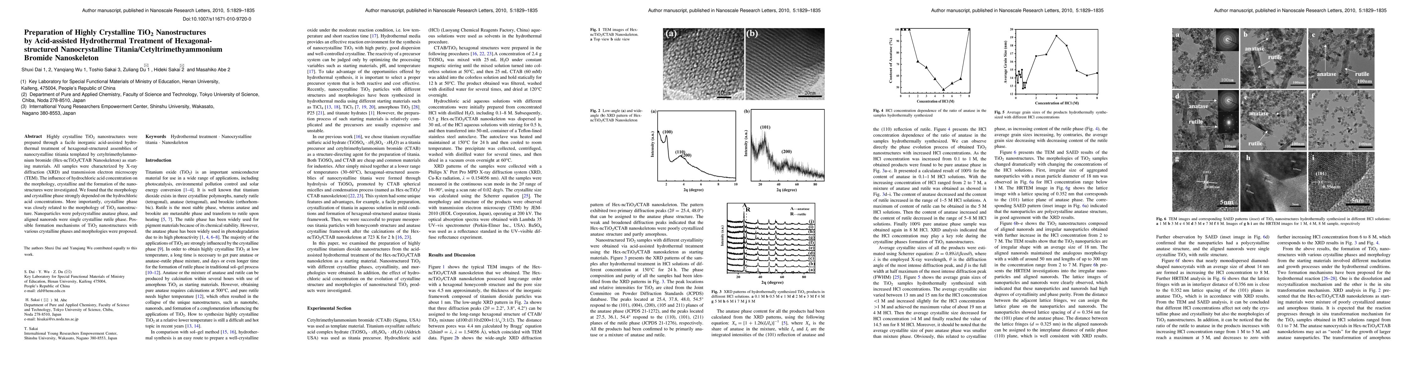 Highly crystalline TiO2 nanostructures were prepared through a facile inorganic acid-assisted hydrothermal treatment of hexagonal-structured assemblies of nanocrystalline titiania templated by cetyltrimethylammonium bromide (Hex-ncTiO2/CTAB Nanoskeleton) as starting materials. All samples were characterized by X-ray diffraction (XRD) and transmission electron microscopy (TEM). The influence of hydrochloric acid concentration on the morphology, crystalline and the formation of the nanostructures were investigated. We found that the morphology and crystalline phase strongly depended on the hydrochloric acid concentrations. More importantly, crystalline phase was closely related to the morphology of TiO2 nanostructure. Nanoparticles were polycrystalline anatase phase, and aligned nanorods were single crystalline rutile phase. Possible formation mechanisms of TiO2 nanostructures with various crystalline phases and morphologies were proposed.