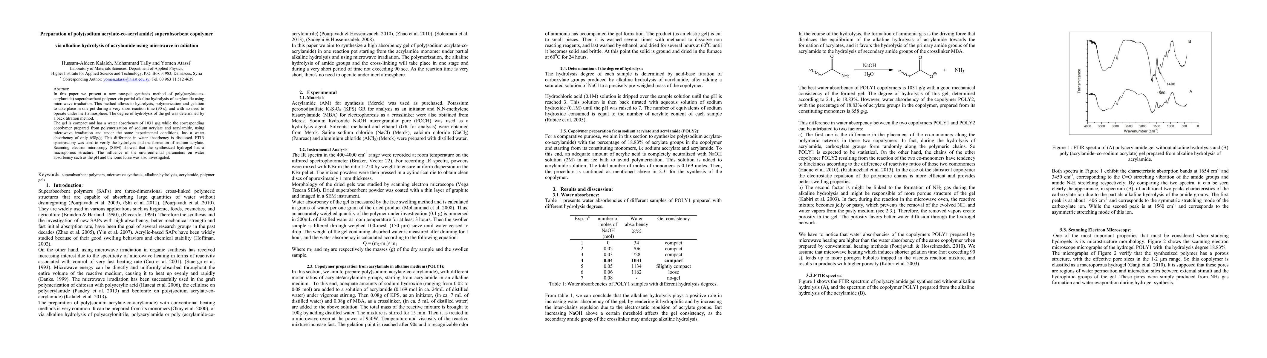 In this paper we present a new one-pot synthesis method of poly(acrylate-co-acrylamide) superabsorbent polymer via partial alkaline hydrolysis of acrylamide using microwave irradiation. This method allows to hydrolysis, polymerization and gelation to take place in one pot during a very short reaction time (90 s), and with no need to operate under inert atmosphere. The degree of hydrolysis of the gel was determined by a back titration method. The gel is compact and has a water absorbency of 1031 g/g while the corresponding copolymer prepared from polymerization of sodium acrylate and acrylamide, using microwave irradiation and under the same experimental conditions, has a water absorbency of only 658g/g. This difference in water absorbency is discussed. FTIR spectroscopy was used to verify the hydrolysis and the formation of sodium acrylate. Scanning electron microscopy (SEM) showed that the synthesized hydrogel has a macroporous structure. The influence of the environmental parameters on water absorbency such as the pH and the ionic force was also investigated.