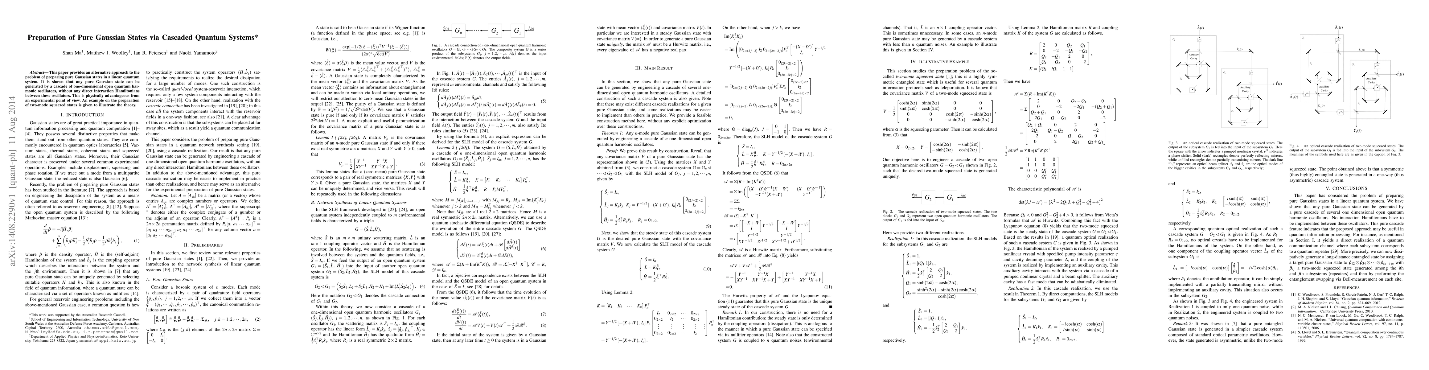 This paper provides an alternative approach to the problem of preparing pure Gaussian states in a linear quantum system. It is shown that any pure Gaussian state can be generated by a cascade of one-dimensional open quantum harmonic oscillators, without any direct interaction Hamiltonians between these oscillators. This is physically advantageous from an experimental point of view. An example on the preparation of two-mode squeezed states is given to illustrate the theory.