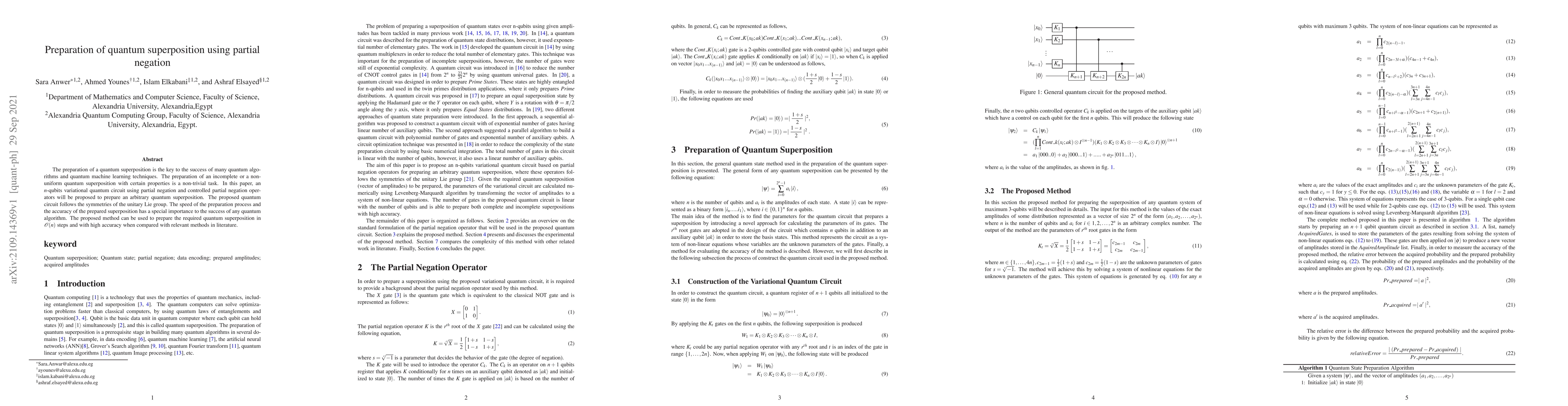 This paper proposes an $n$-qubits variational quantum circuit using partial negation and controlled partial negation operators to prepare an arbitrary quantum superposition efficiently in $\mathcal{O}(n)$ steps, emphasizing the importance of preparation speed and accuracy for quantum algorithms.