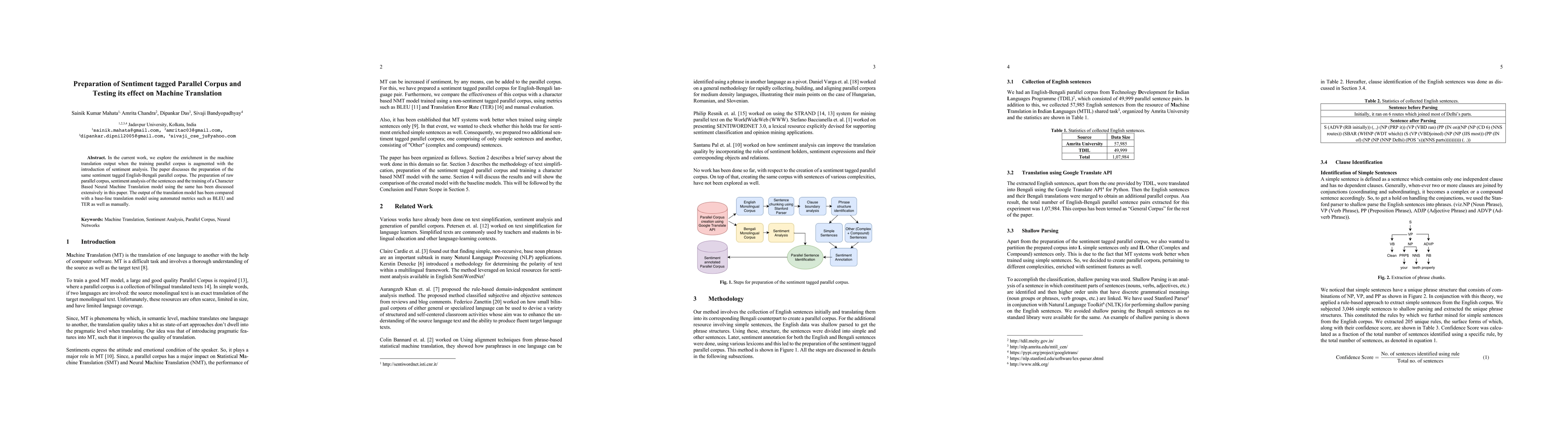 This paper investigates the impact of sentiment-tagged parallel corpora on machine translation performance. The study prepares a sentiment-tagged English-Bengali parallel corpus and trains a Character Based Neural Machine Translation model on it, comparing its output against a baseline model using automated metrics like BLEU and TER, as well as manual evaluation.